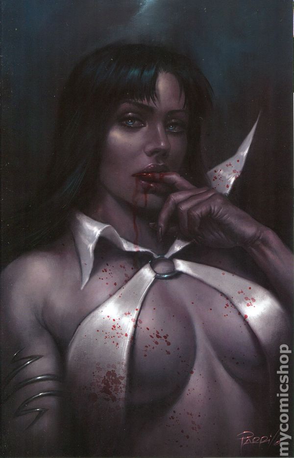 Limited 1 for 15 Retailer Incentive Variant Cover. Written by Christopher Priest. Art by Ergun Gunduz and Giovanni Timpano. Cover by Lucio Parrillo. Following the explosive conclusion to Vampirella/Dracula: Unholy comes the next chapter in Christopher Priest's Vampirella saga! Wanted for murder, and with every demon, shaman, vampire, whack-job zealot, reporter, and law enforcement officer on Earth hunting for her, Vampirella has taken refuge in an undisclosed location where she questions why she came to our world in the first place. 32 pages, full color. Rated T+ Cover price $3.99.