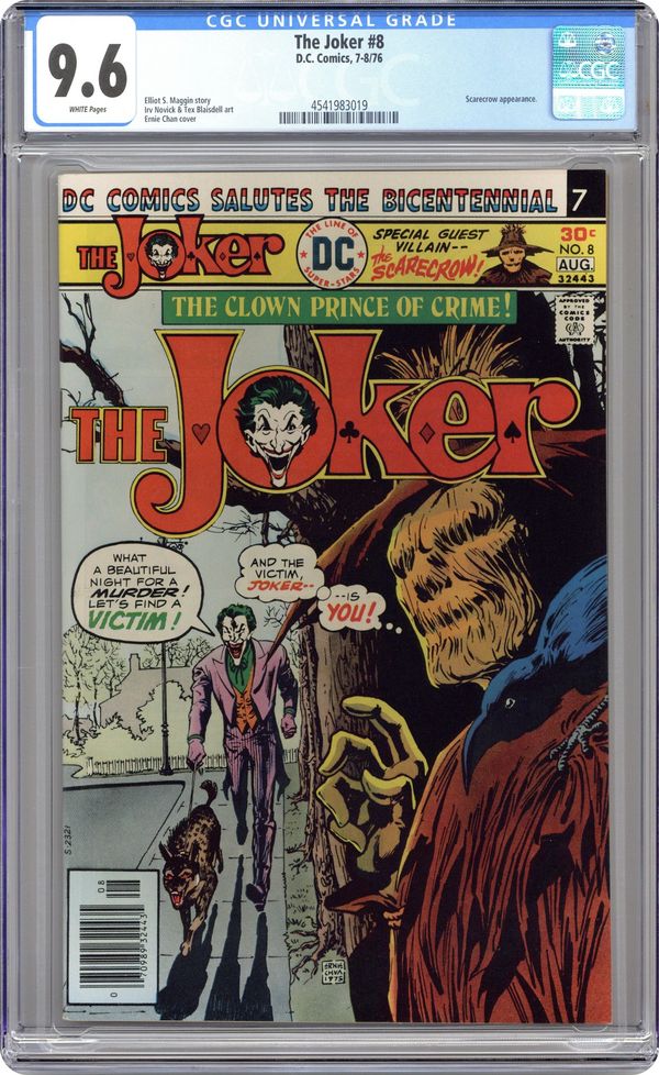 Cover by Ernie Chan (as Ernie Chua). Featuring: 17 page Joker story "The Scarecrow's Fearsome Face-Off!" Characters: the Joker, the Scarecrow [Jonathan Crane], Southpaw (Joker's henchman), Tooth (Joker's henchman), Dr. Farr, Nightmare (Scarecrow's pet raven), Sonny November; Jerry (student). In this tale, when the Joker makes a robbery dressed as the Scarecrow, the real Scarecrow hunts him down to exact revenge. Written by Elliot S! Maggin, with art by Irv Novick and Tex Blaisdell. Cover price $0.30.