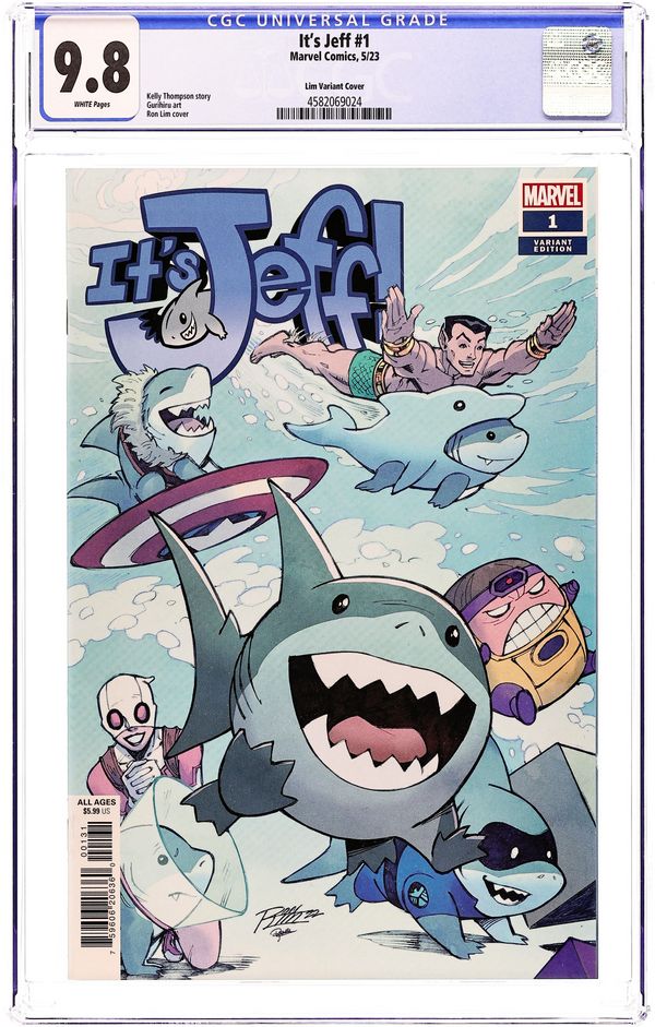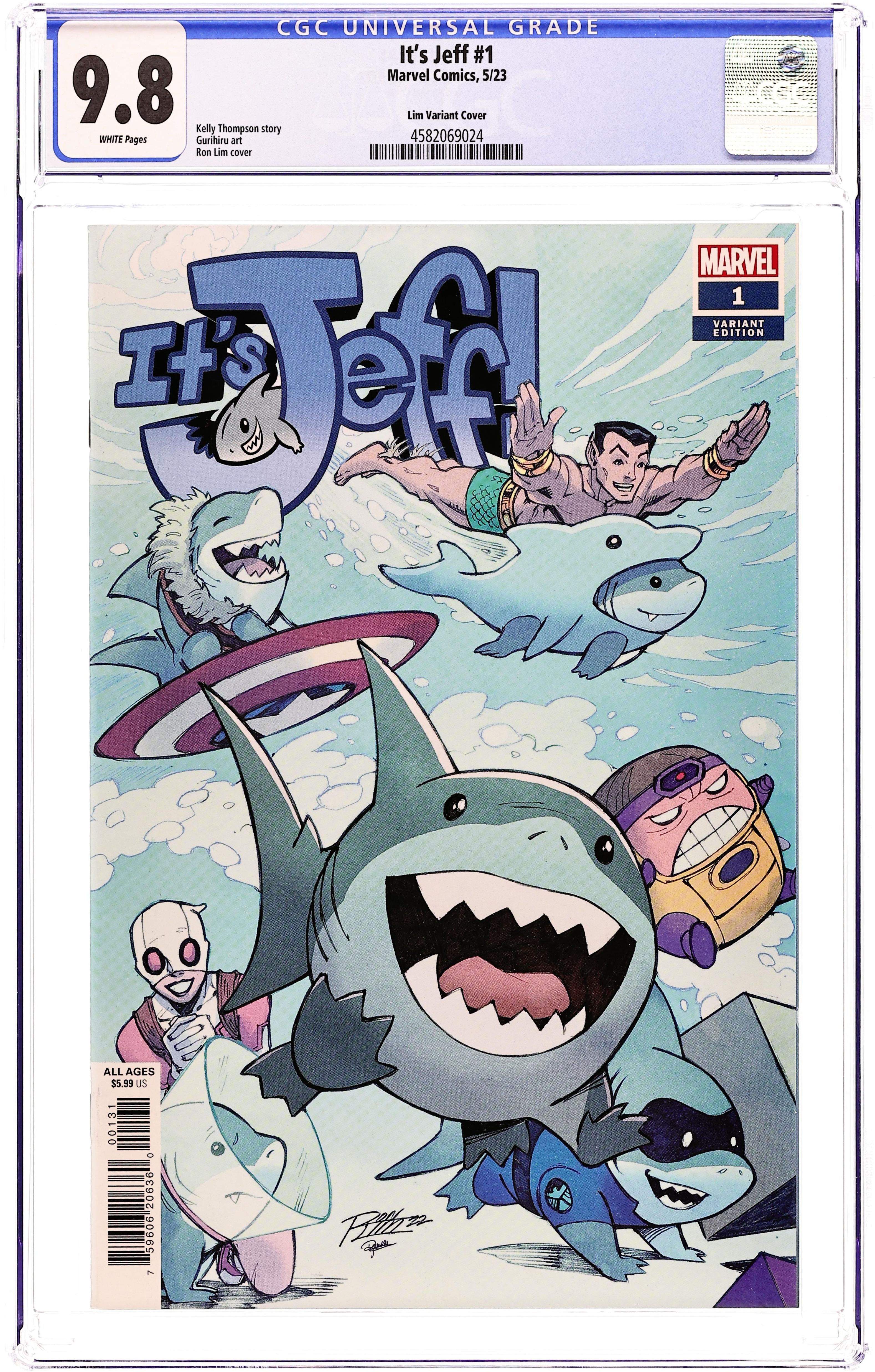 Written by Kelly Thompson. Art by Gurihiru. Cover by Ron Lim. JEFF THE LANDSHARK STARS IN HIS OWN FIN-TASTIC COMIC! Since his very first appearance, Jeff the Land Shark has flooded our hearts like an adorable tidal wave! Now the ingenious, the extraordinary, the unbearably innocent Jeff embarks on his own adventures across the Marvel Universe! You thought it was safe doing laundry or going for a leisurely swim in the pool…but no activity can protect against Jeff's cuteness! Collecting the hit Infinity Comics series from the Marvel Unlimited app, this one-shot features a brand-new cover and tail...we mean tale! 48 pages, full color. Cover price $5.99.