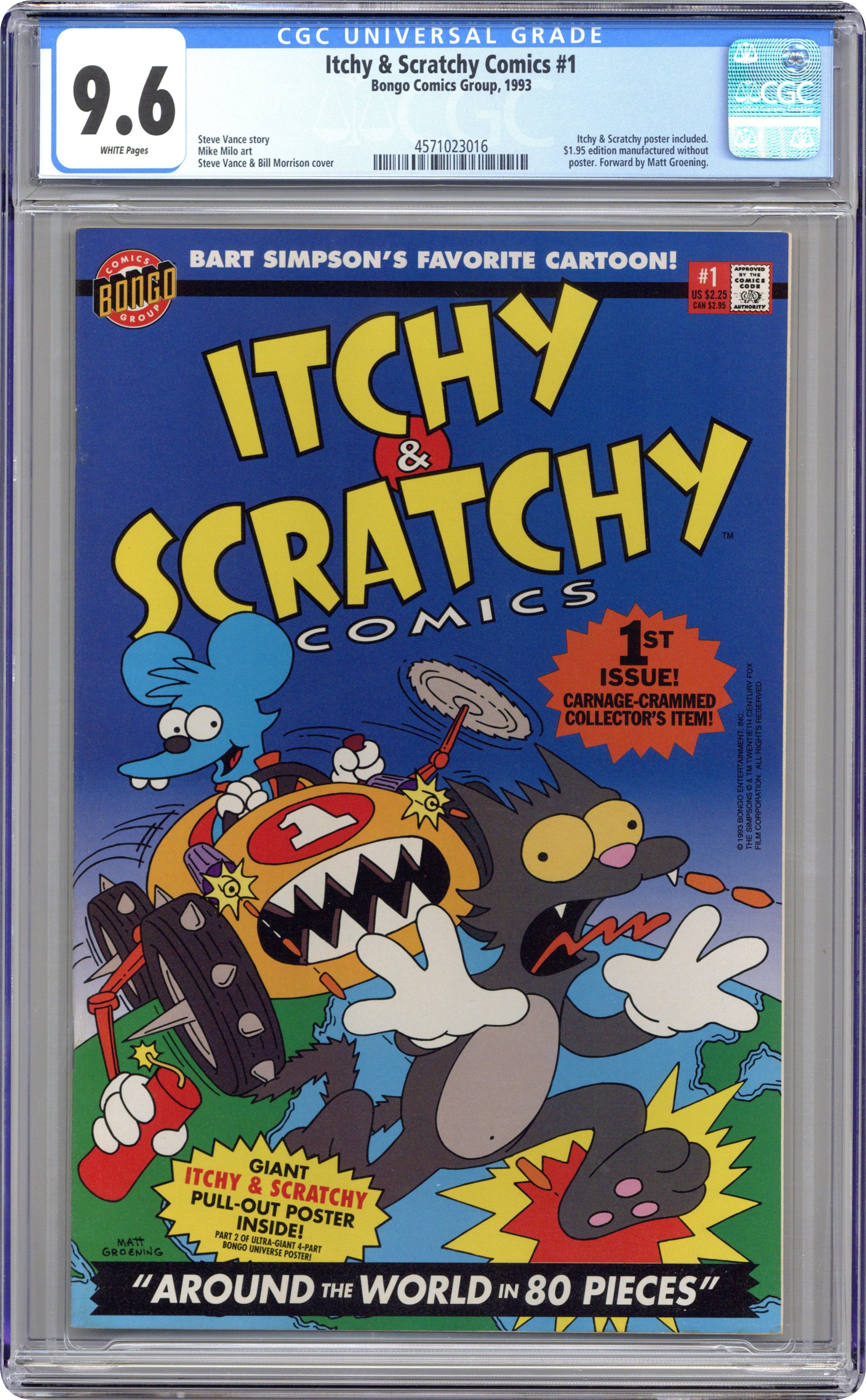 Direct Edition with poster included. Cover pencils by Steve Vance, inks by Bill Morrison; Itchy and Scratchy's cartoon mayhem extends into their real lives when they enter a race around the world. Diagram of Itchy and Scratchy's body parts. A list of Itchy and Scratchy's top 40 things...all of them violent. 36 pgs., full color. $2.25. Cover price $2.25.