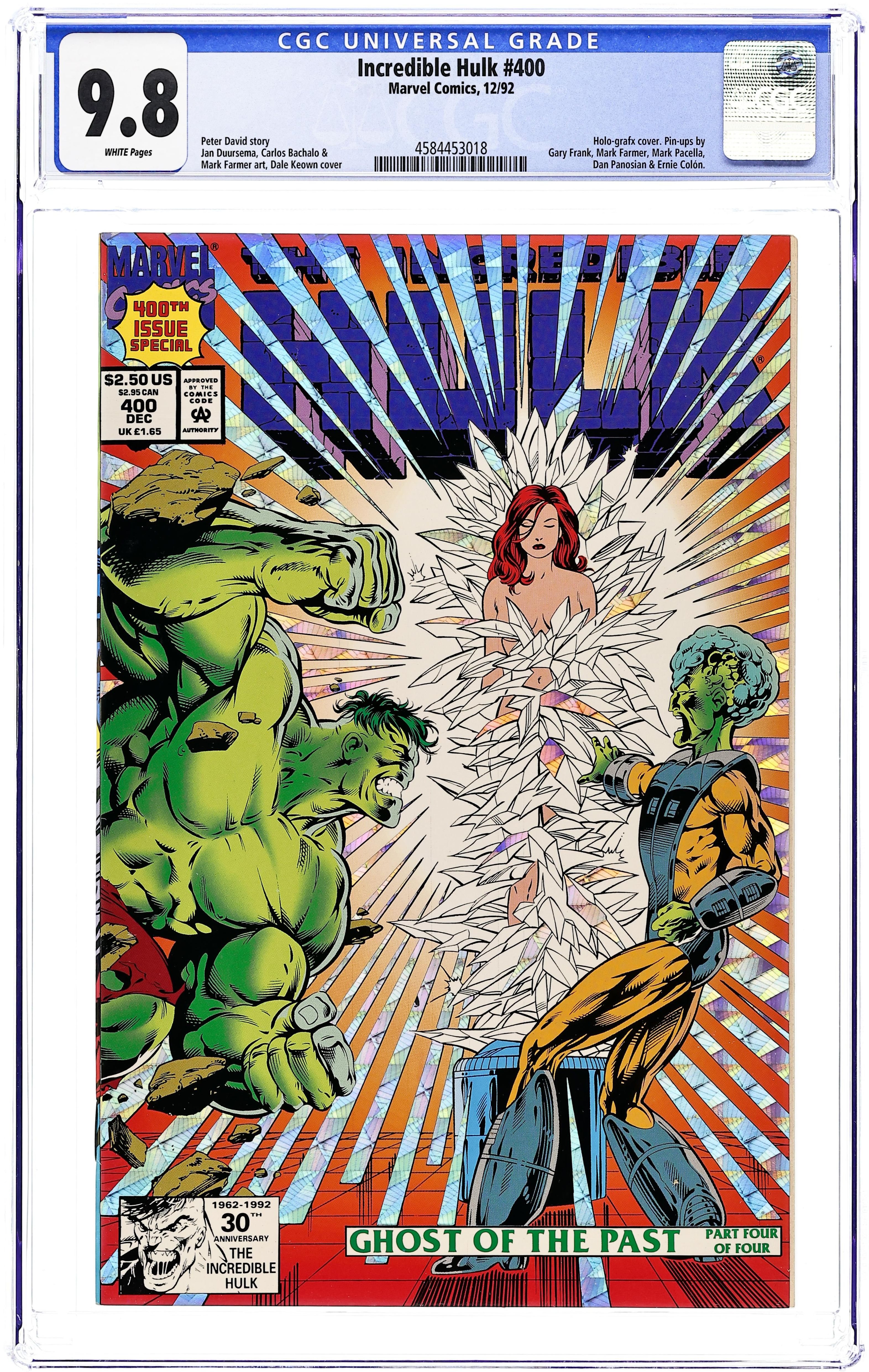 First Printing. Direct Edition. 400 Issue Special. Ghost of the Past 4 of 4. "Deus Ex-Machina!" Story by Peter David. Art by Jan Duursema and Mark Farmer. Marlo is dead. Will Rick do the unthinkable...will he strike a deal with the nefarious Leader to bring back the woman he loves? More importantly, will the Hulk let the Leader live long enough to do it? Includes pin-ups by Gary Frank, Mark Farmer, Mark Parcella, Dan Panosian, and Ernie Colon. Plus, reprints the 1st appearance of the Leader. Story by Stan Lee. Art by Steve Ditko and Geo Bell. 68 pages. Cover price $2.50.