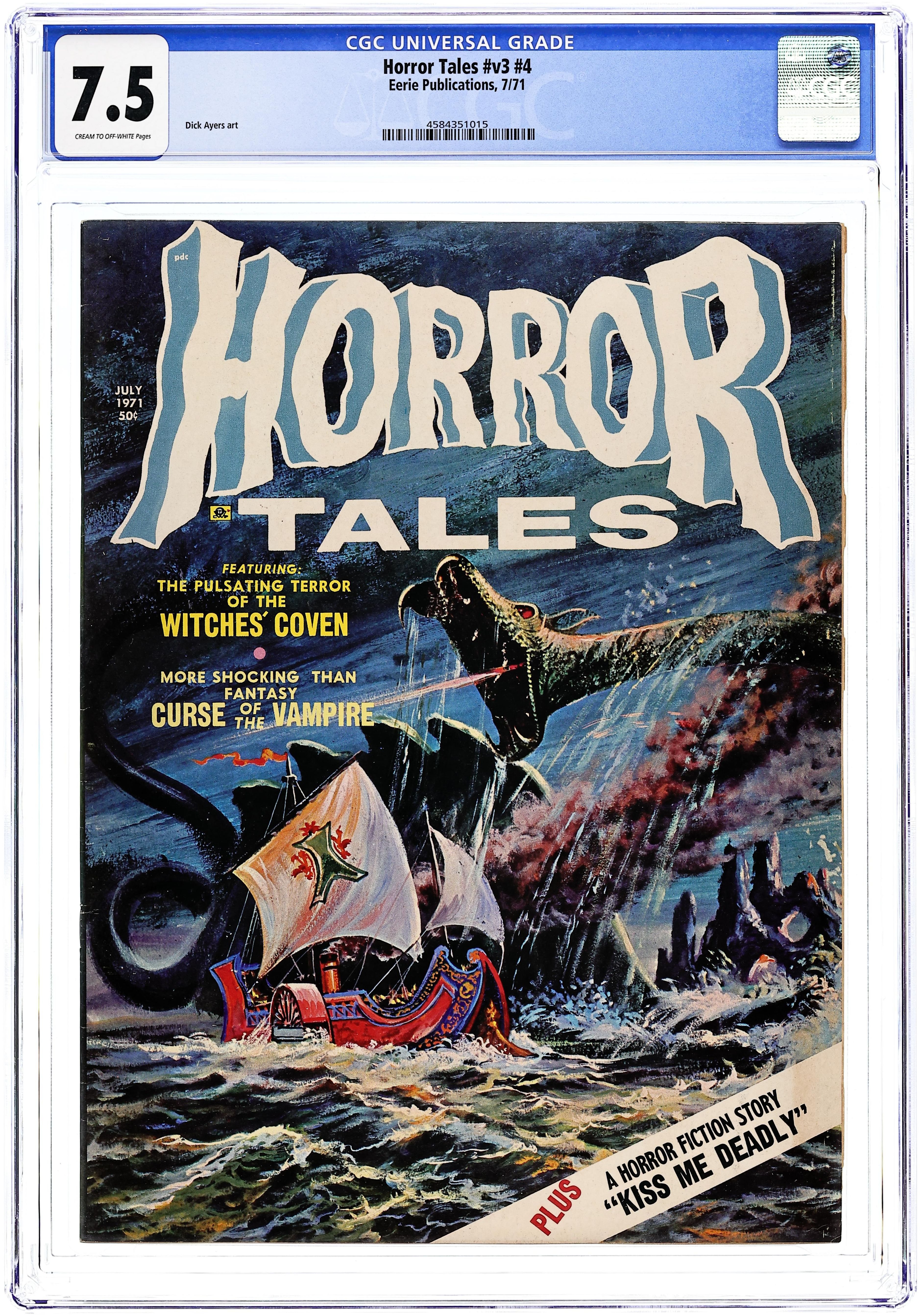Cover by Johnny Bruck. Stories and art by Dick Ayers, Ezra Jackson, Larry Woromay, and Robert Hayward Webb. Legendary publisher Myron Fass presents another Eerie series, featuring tales of horror and the macabre. A hobo stumbles on a witches' coven and makes a devil's bargain. A land developer digs for oil in an old Native American burial ground, until a beautiful woman captures his heart. A reporter learns what killed all the members of an Army regiment. Featuring altered reprints from Haunted Thrills (1952) and other 1950s pre-Code comics. Cover painting by Johnny Bruck originally appeared in Germany's Perry Rhodan. Curse of the Vampire; The Witches Coven; Kiss Me Deadly; The Horror Dolls; Doom at the Wheel; Careless Corpse; Death's Shoes. 8 1/2-in. x 11-in., 48 pages, B&W. Mature readers. Cover price $0.50.