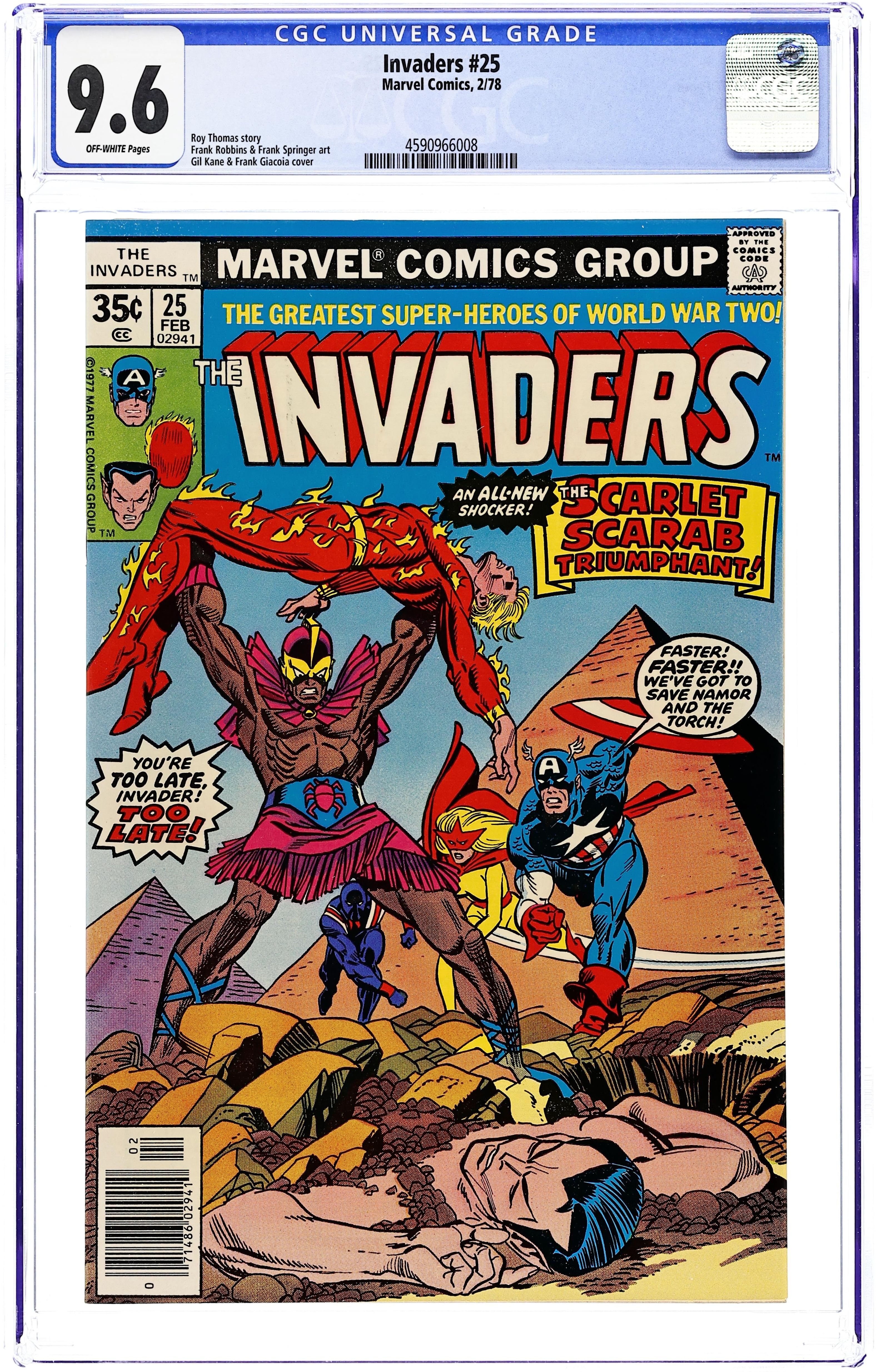 Part 2 of 2 - "The Power of the Panzers!" Story continued from Invaders #23. Written by Roy Thomas. Art by Frank Robbins and Frank Springer. Even the power of the Invaders pales in comparison to that of the Scarlet Scarab. Can even the greatest heroes of World War II survive this fateful confrontation? 32 pages FC Cover price $0.35.