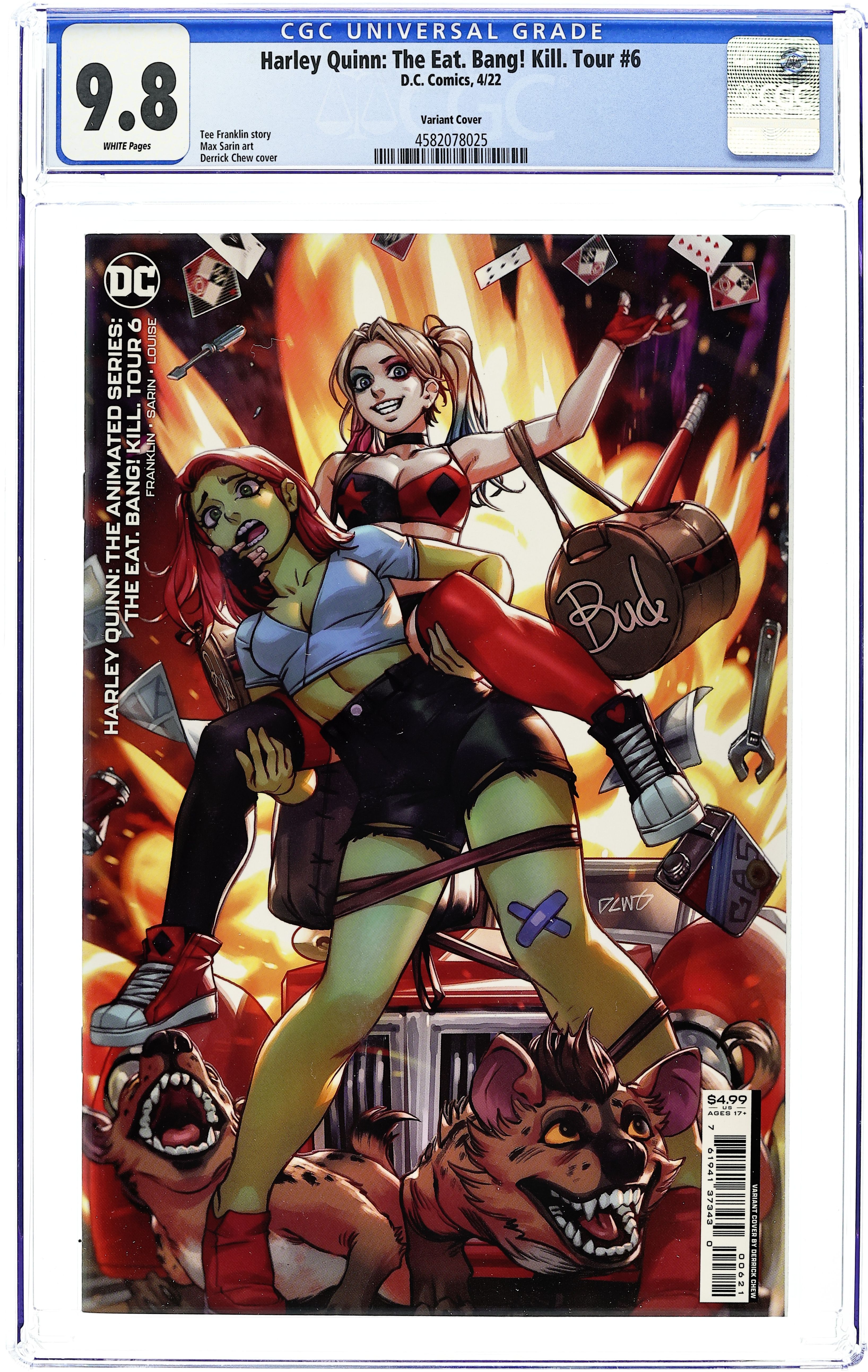 Cover by Dan Hipp. What happens when writers from Harley Quinn the TV show and Harley Quinn: The Animated Series: The Eat. Bang! Kill. Tour the comic book get together and swap stories from New Gotham? Absolute mayhem, thats what! Follow what happened to some of your favorite Gotham sidekicks on Tawny Youngs new trash-tastic daytime talk show and watch the chairs fly as they spill the tea! Guest-starring Clayface, Batgirl, Frank the Plant, and Harley Quinns worst sidekick…The Joker! 80 pages, full color. Mature Readers Cover price $9.99.