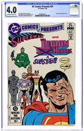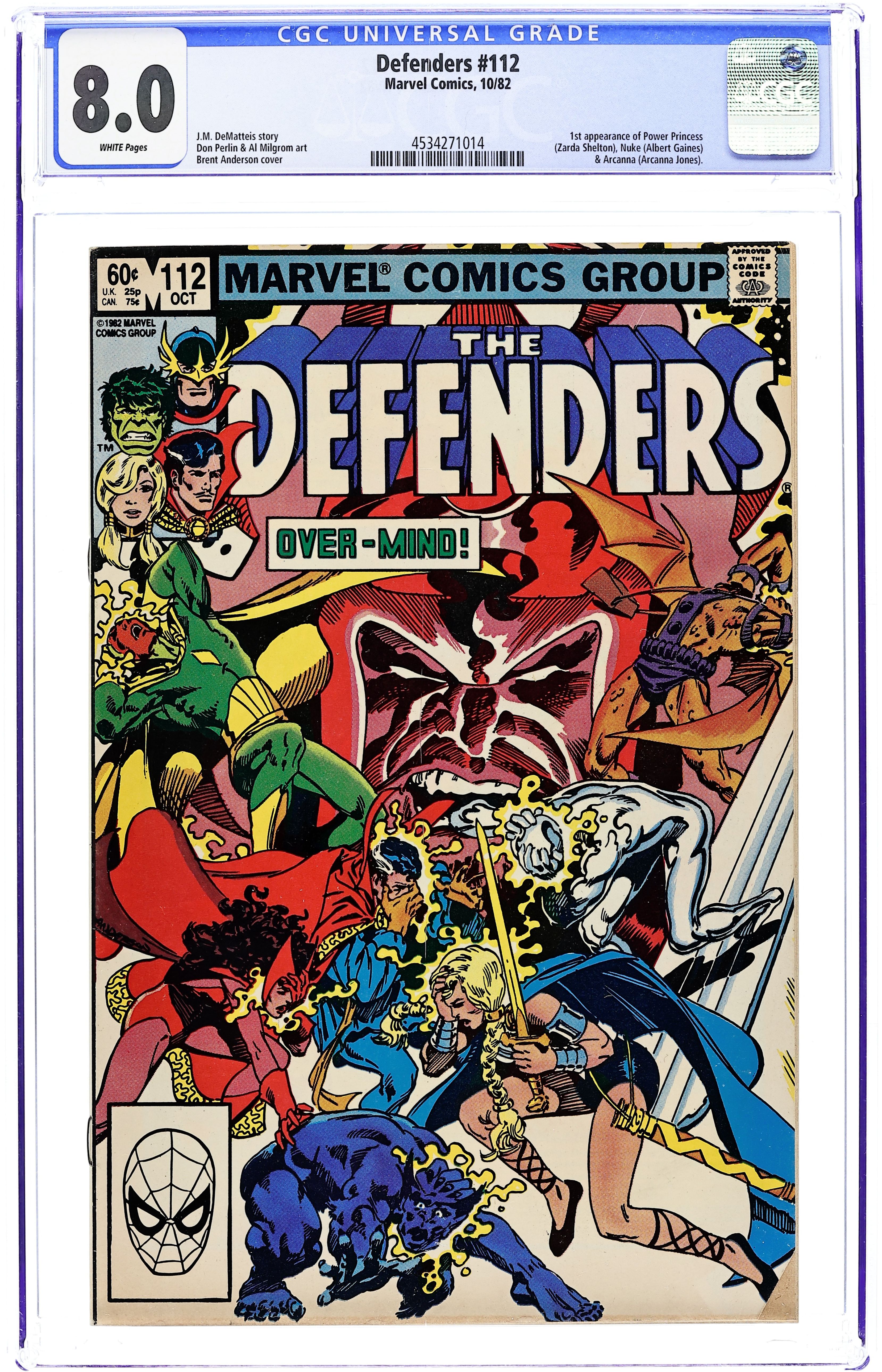 Defenders/Squadron Supreme team-up - "Strange Visitor from Another Planet!" Part 1 of 3. Guest-starring the Vision and the Scarlet Witch. Script by J.M. DeMatteis. Pencils by Don Perlin. Inks by Mike Gustovich. Cover by Brent Anderson. Following the events of Avengers Annual #11, the Defenders host a party at their Upper West Side brownstone. But the festivities are halted when Dr. Strange dramatically appears in astral form! The good doctor has discovered a crisis on another Earth. Specifically, Earth-712 --the home of the Squadron Supreme! And it's a place the Beast, Wanda, and the Vision know very well. What has gone wrong on the squadron's world this time? Hyperion and Nighthawk spin an unbelievable tale -- of how theOvermind took over the United States and the Squadron Supreme! Cameo appearances by August Masters, Chorus, and Vera Cantor. Flashback cameo by the Avengers to recap the Serpent Crown saga in Avengers 141-148. Defenders Lineup: Beast, Dr. Strange, Gargoyle, Hellstorm, Hulk, Silver Surfer, Sub-Mariner, and Valkyrie. (Note: The Overmind previously appeared in Fantastic Four 116.) 36 pages. Cover price $0.60.