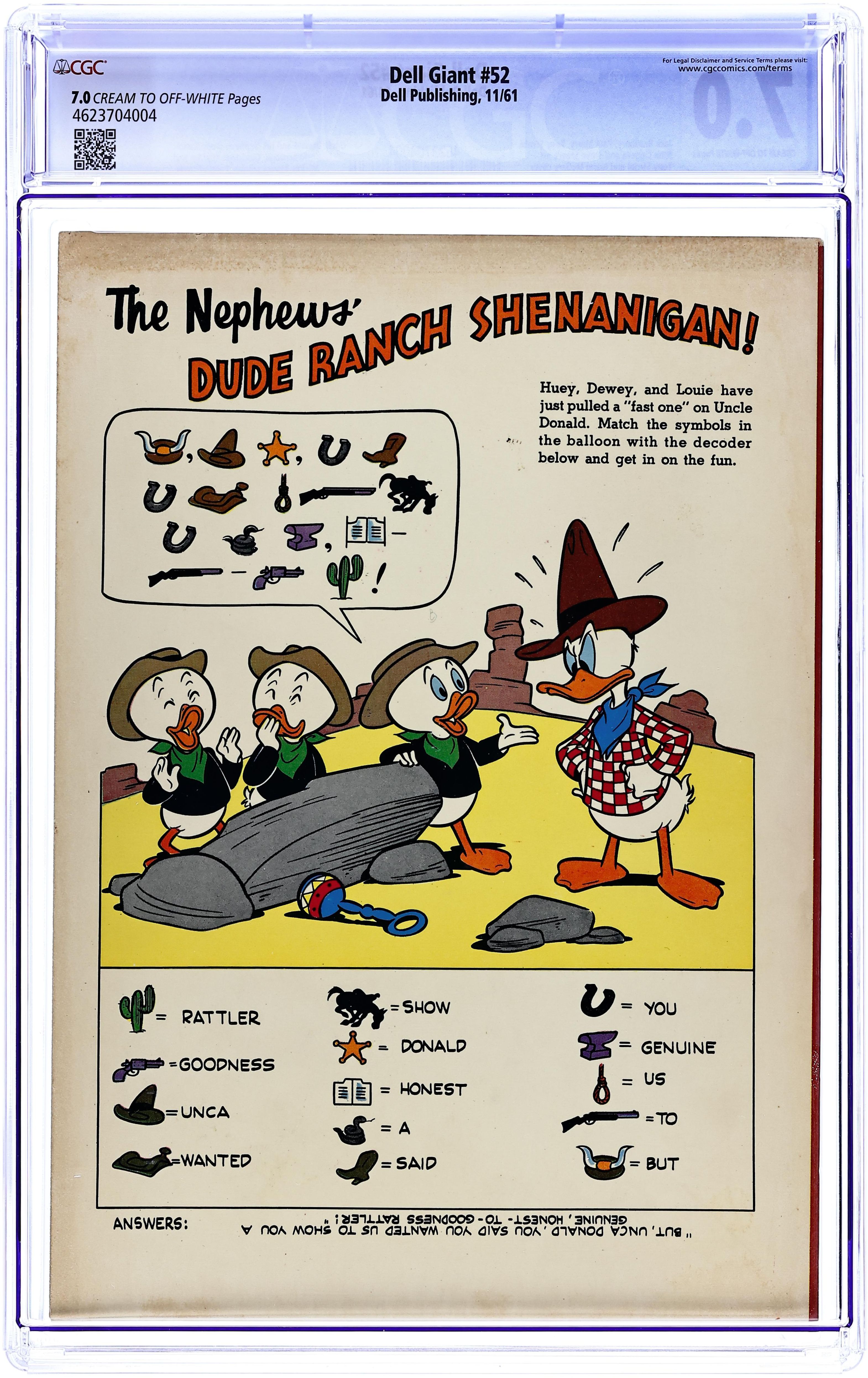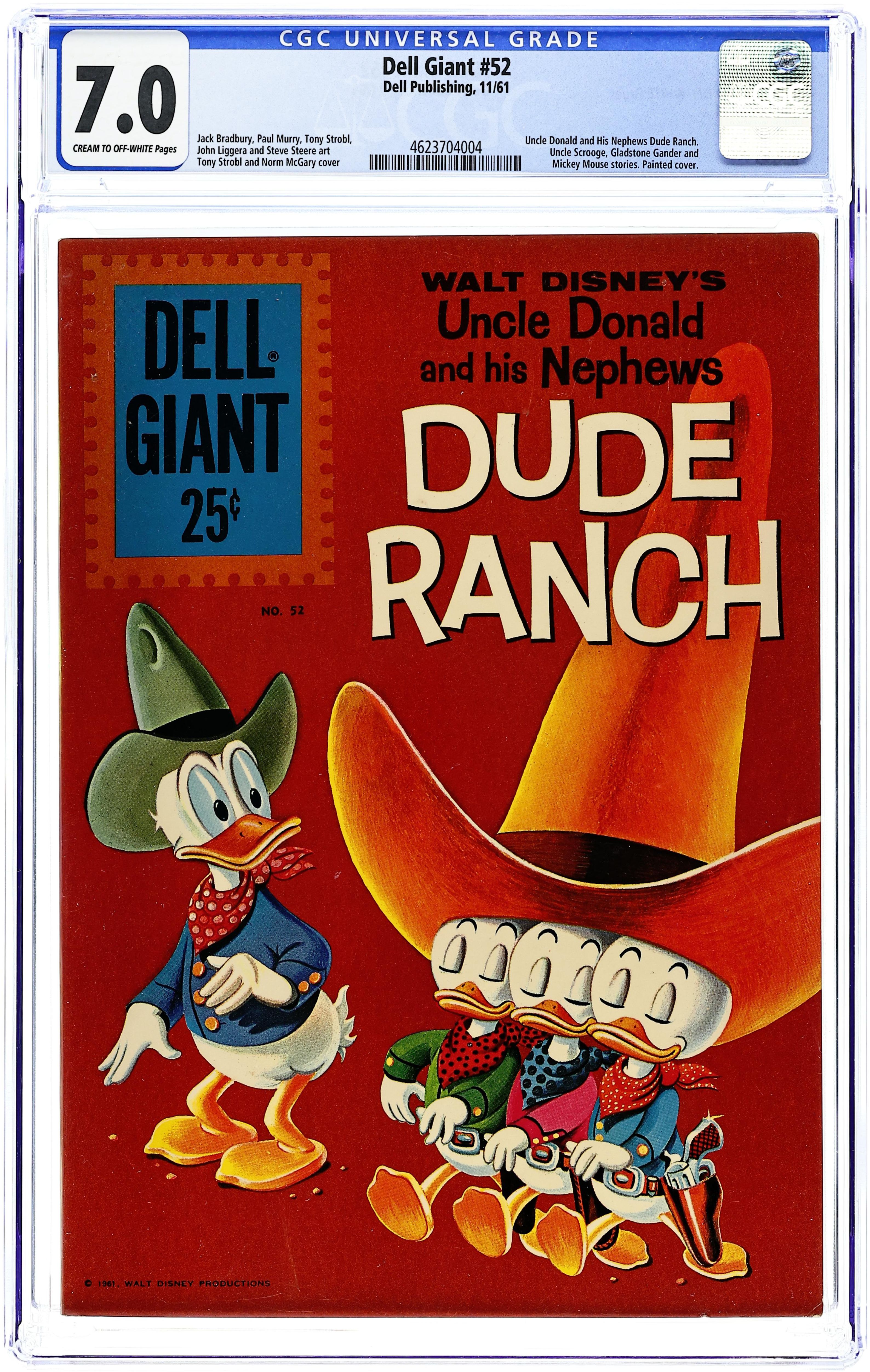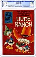 Walt Disney's Uncle Donald and His Nephews Dude Ranch. Also Mickey Mouse and Minnie in "The Big Canvas Caper," Ludwig Von Drake in "The Sky Range Rider," Grandma and Daisy in "Lady Lawmen," Goofy, Morty, Ferdie, and Pluto in "Tribe Trouble," Gladstone Gander in "A Test of Luck," Uncle Scrooge and Gyro Gearloose in "Hum on the Range," and Donald and his Nephews in "He Went Thataway." 84 Pages, Full Color. Cover price $0.25.