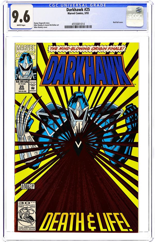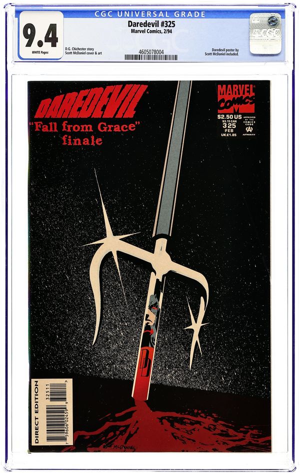 Elektra guest stars in Fall From Grace part 6 of 6, "Salvation for the Damned!" Script by D.G. Chichester, pencils by Scott McDaniel, inks by Hector Collazo. Morbius appearance. Kingpin cameo. The giant-size issue includes a large bound-in, fold-out poster by McDaniel/Garrahy. The letters page contains a statement of ownership--average print run 192,834; average paid circulation 125,292. McDaniel cover. Cover price $2.50.