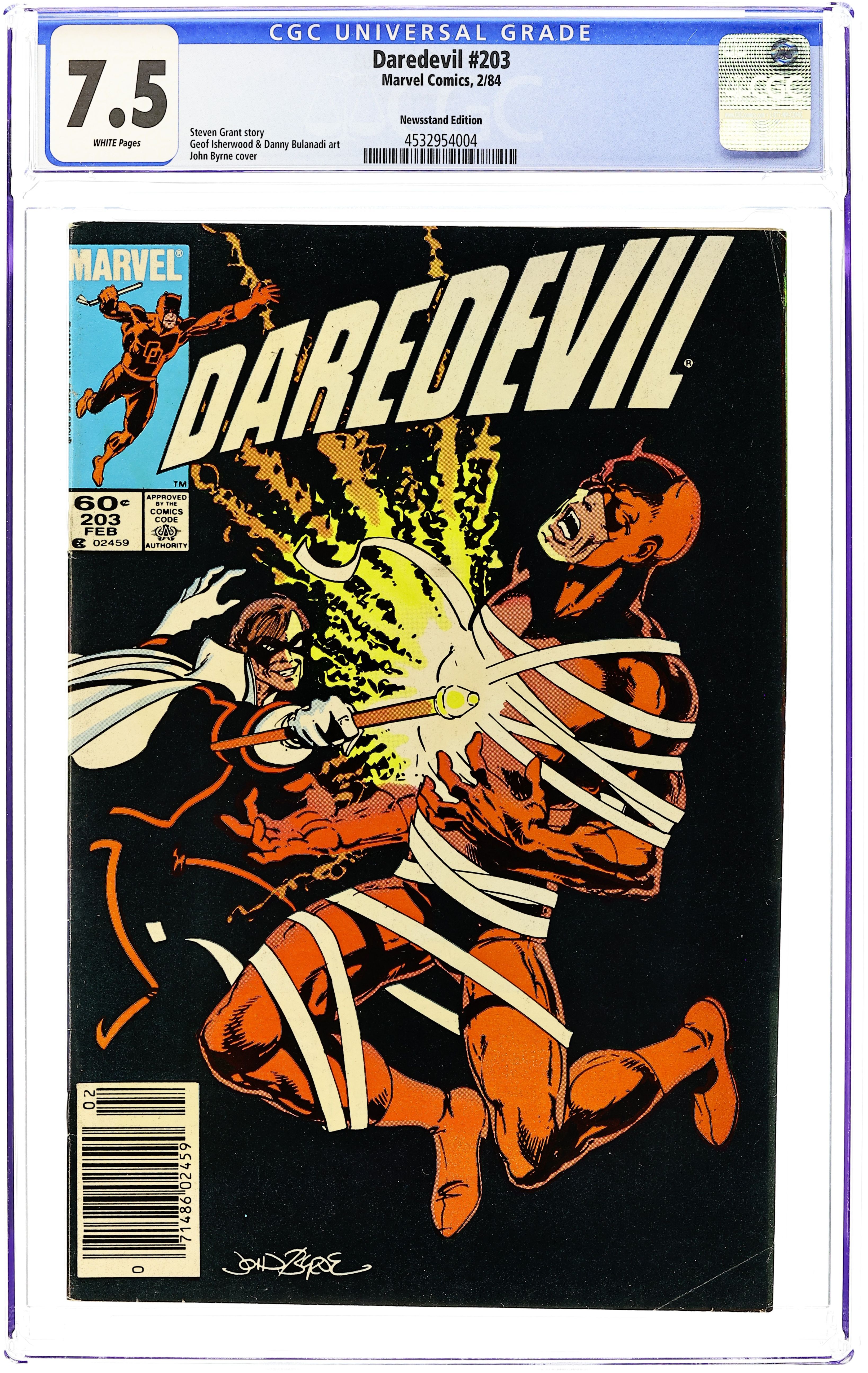 Newsstand Edition. Cover art by John Byrne. Trumps starring Daredevil, Foggy Nelson, Ben Urich, Becky Blake,The Trump [Carlton Sanders], Stymie Schmidt, Turk, and Grotto, script by Steven Grant, pencils by Geof Isherwood, inks by Danny Bulanadi; Dardevil busts up the Trump's gang during a gun theft and captures one of the tormentors who made his childhood a living hell. Cover price $0.60.