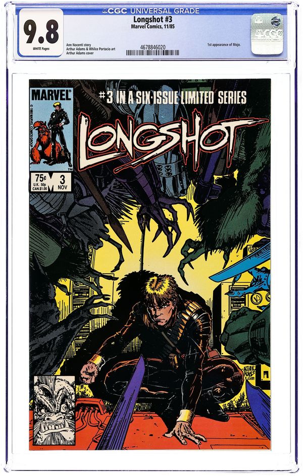 Newsstand Edition. 1st Art Adams pro work. Arriving on Earth unsure of his own identity, Longshot tries to rescue a kidnapped baby in "A Man Without a Past." Script by Ann Nocenti. Pencils by Arthur Adams (his first pro work). Inks by Whilce Portacio & Anderson. Cover by Adams. 1st appearance of Longshot and Spiral. Cover price $0.75.