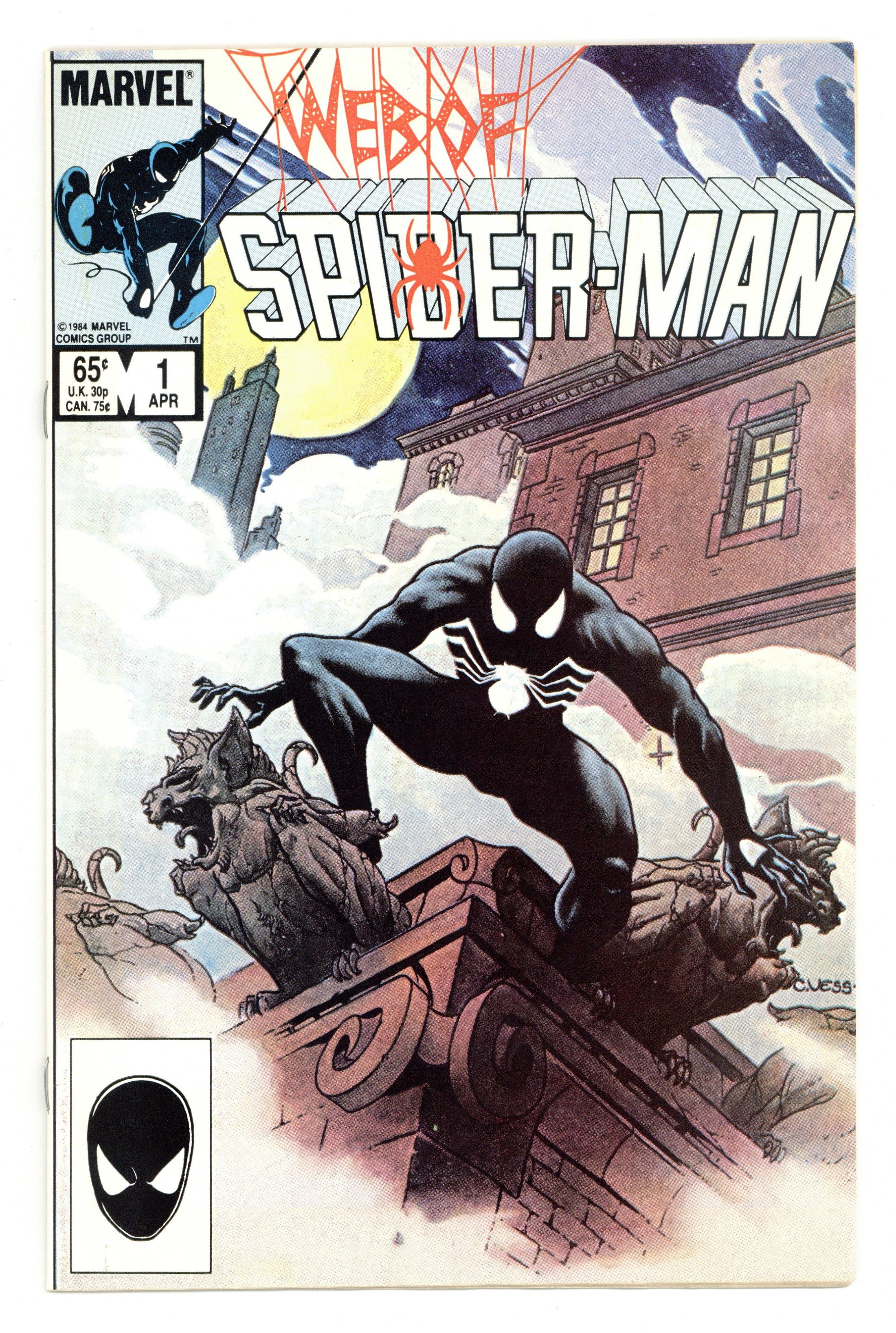 Tags: Spider-Man$65.00Direct Edition. "Til Death Do Us Part!" Story by Louise Simonson. Art by Greg LaRocque and Jim Mooney. Painted cover by Charles Vess. The alien symbiote (aka black costume) ambushes Peter Parker while he is getting dressed. Now Spider-Man must battle the black costume and the new Vulturions on his way to the Baxter Building! Meanwhile, Aunt May laments Peter's decision to drop out of graduate school. (Note: The Web of Spiderman series essentially replaced the Marvel Team-Up title as Marvel's third regular series featuring Spider-Man.) 32 pages Cover price $0.65.