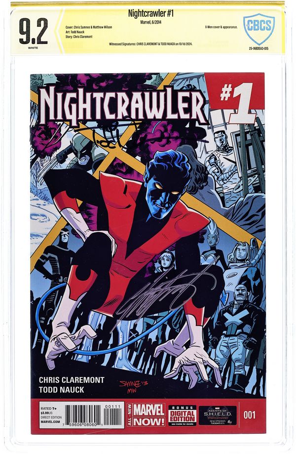 Cover by Chris Samnee. Written by Chris Claremont. Art by Todd Nauck. NIGHTCRAWLER IS BACK! Newly-returned from the afterlife, veteran X-Man Kurt Wagner finds himself in a world that's a far cry from the one he left: Professor Xavier is dead, Cyclops is on the run, and the X-Men are divided. But determined not to let his new lease on life go to waste, Nightcrawler hits the road alongside Wolverine, eager to right some wrongs and safeguard the future mutantkind...and he's going to do it by the means he loves most: swashbuckling, lady-charming and-of course-BAMFing! Cover price $3.99.
