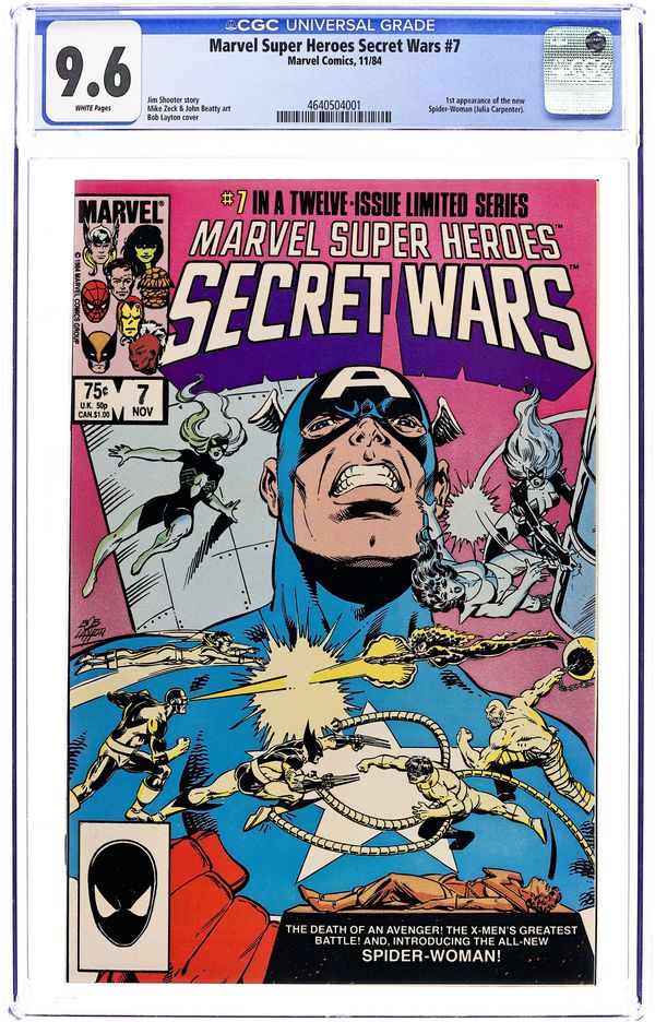 Direct Edition. 1st appearance of Spider-Woman II (Julia Carpenter). "Berserker!" Part 7 of 12. Story by Jim Shooter. Art by Mike Zeck and John Beatty. Introducing Marvel's newest super-hero, Spider-Woman, a refugee from the displaced Denver, Colorado (NOTE: The Beyonder created Battleworld from pieces of hundreds of worlds from across the universe, Denver was one of those pieces). Plus, when the villains dump the Wasp's lifeless body into the heroes' camp, the Savage She Hulk decides to pay the bad guys a visit for some payback. But, has the emerald heroine finally bitten off more than she can chew? 36 pages, full color. Cover price $0.75.
