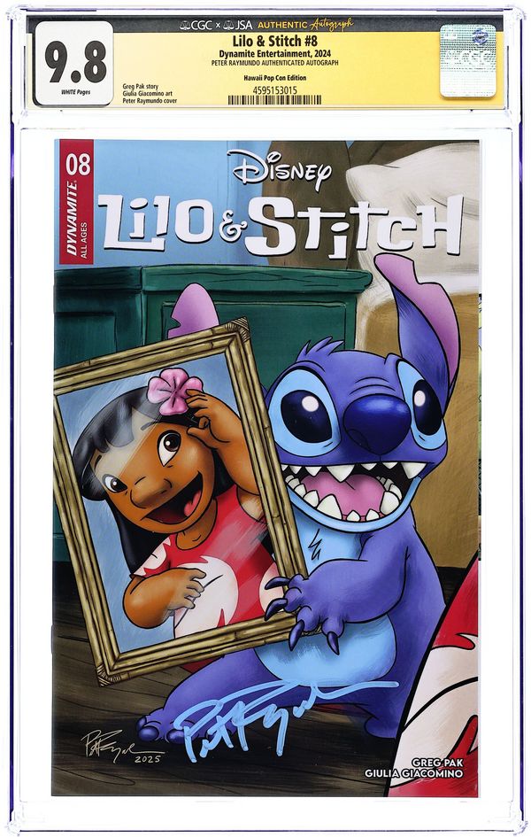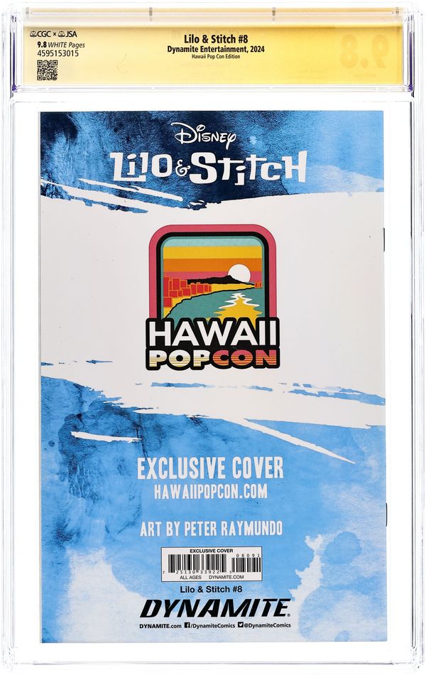 Hawaii Pop Con Exclusive Variant Cover by Peter Raymundo. Written by Greg Pak. Art by Giulia Giacomino. When Lilo and Stitch discover that the families of their monster friends are being held behind bars in a maximum-security zoo, they immediately demand that the Galactic Federation set them free. But the treaty that keeps them locked up is ironclad, and not even the Grand Councilwoman herself can break it. Will the pair patiently wait the 30 years that it will take for an amendment to the treaty to be passed by the Federation bureaucracy? Well, anything is possible -but to find out what really happens, pick up GREG PAK and GIULIA GIACOMINO's Lilo & Stitch #8, where answers awaits within eye-catching covers by NICOLETTA BALDARI, TRISH FORSTNER, EDWIN GALMON, and CRAIG ROUSSEAU! ALL CARDSTOCK COVERS! 32 pages, full color. NOTE: Generic image is of a signed copy, this does not necessarily reflect all copies.