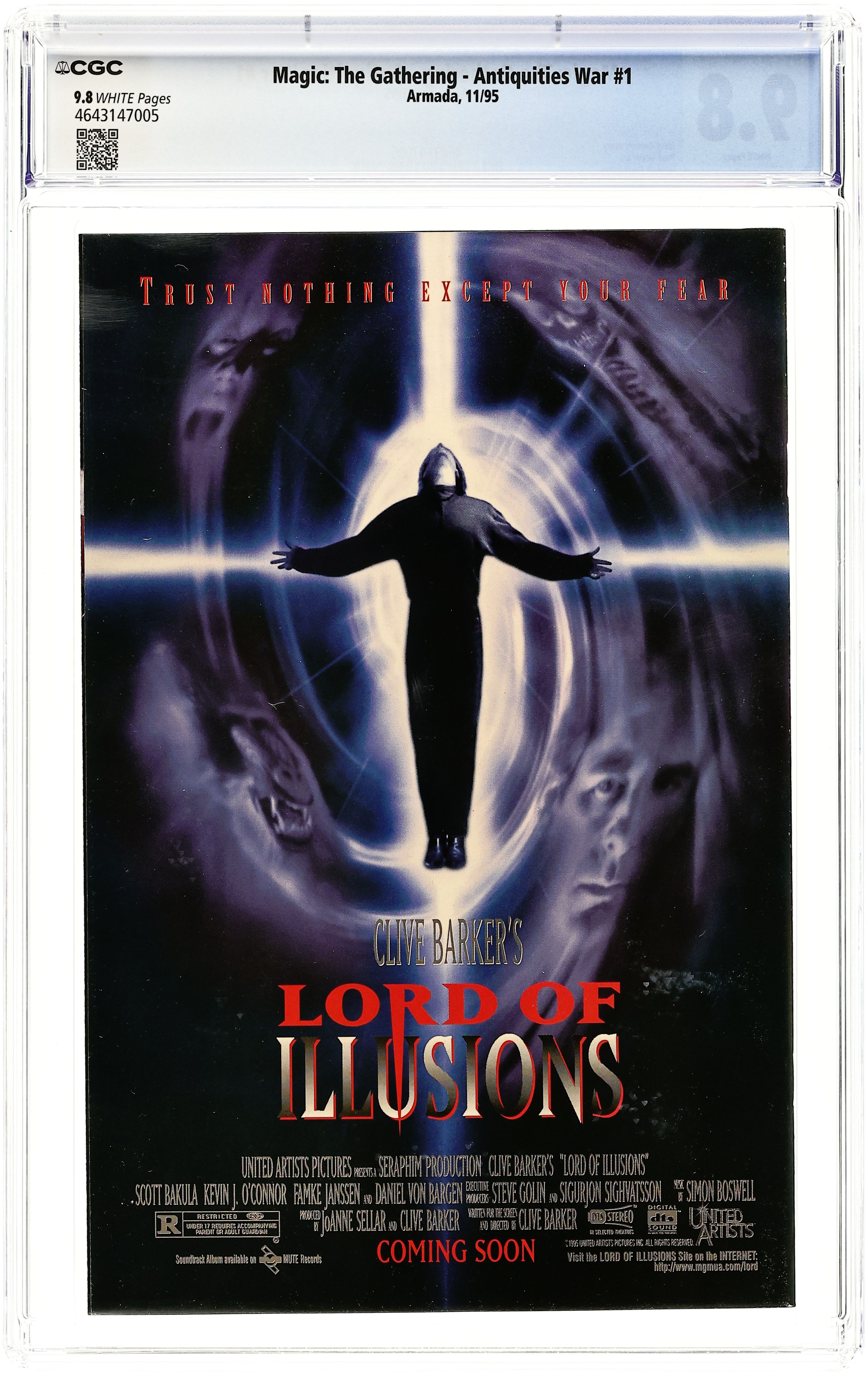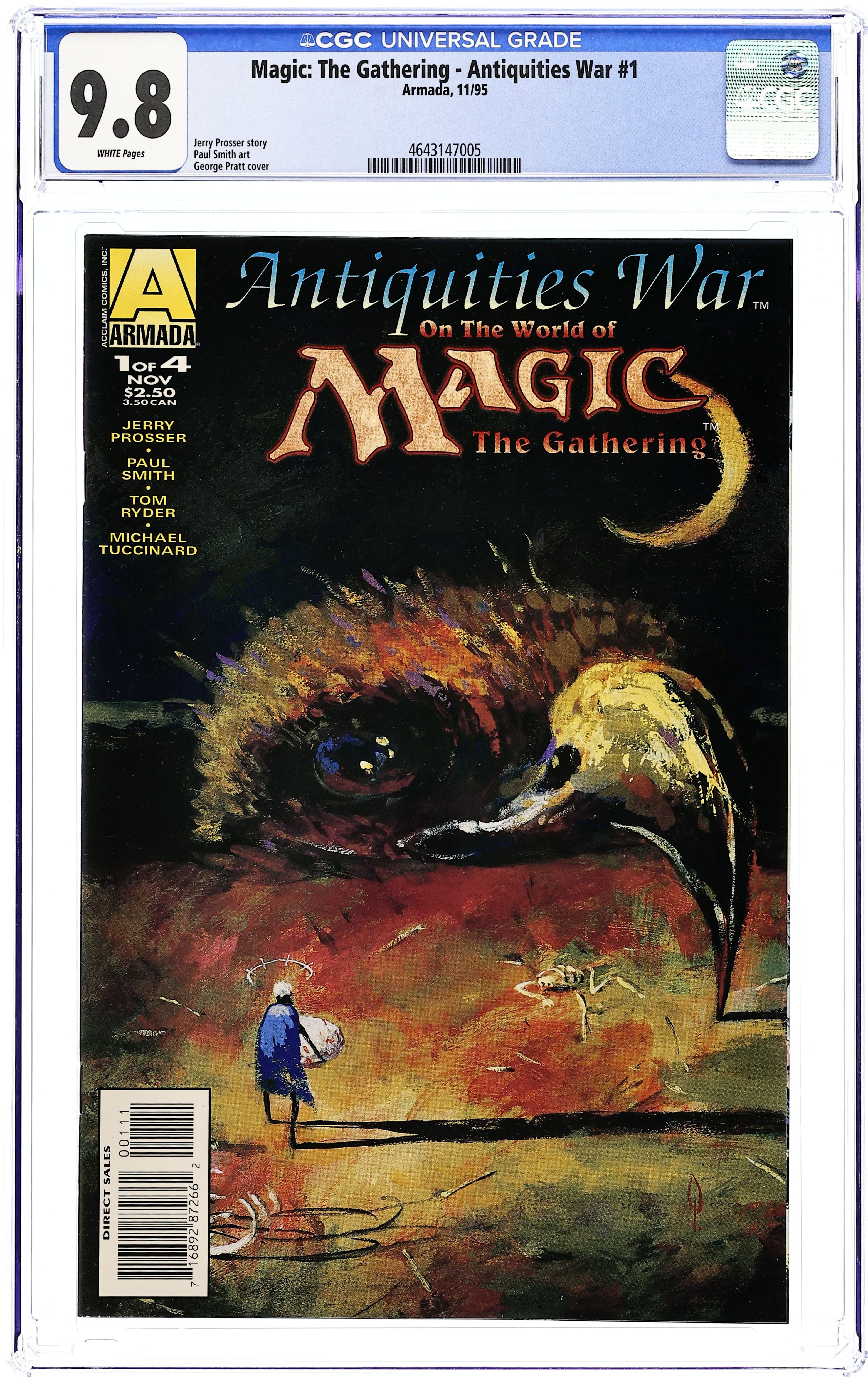 The greatest, most spectacular magical war in the history of Magic: The Gathering starts here! Adapted from the events depicted in the "Antiquities" expansion of the Magic: The Gathering card game, this series introduces readers to Urza and Mishra, two brothers destined for tragedy! This stunning first installment tells the stories of the Mightstone and the Weakstone, and the origin of an enmity so sweeping that millions of lives were lost while mecha-magical monstrosities were brought forth from the fires of hatred in a war that lasted decades! Written by Jerry Prosser, with art by Paul Smith and Tom Ryder. Painted cover by George Pratt. Cover price $2.50.