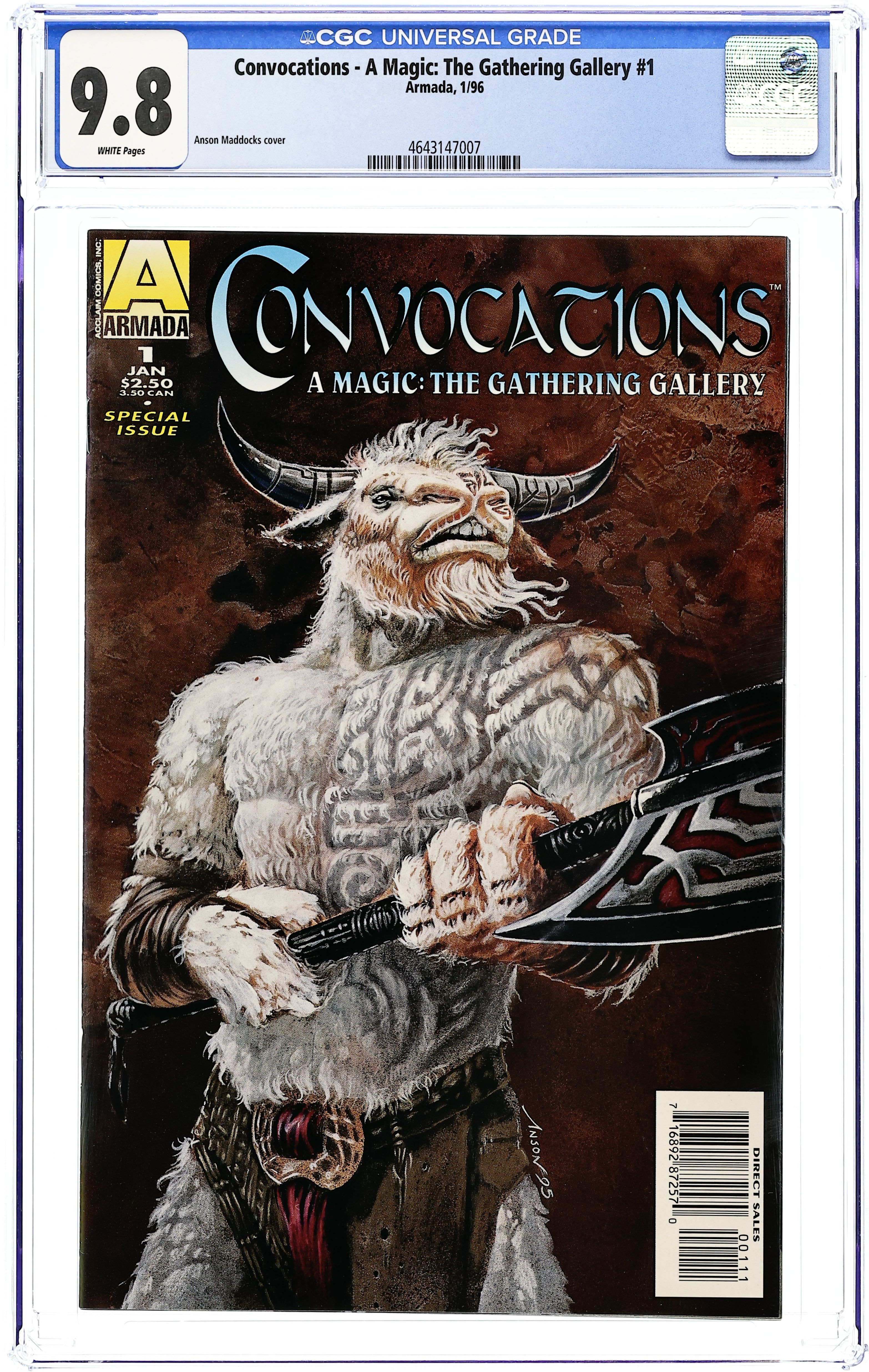 A collection of today's brightest stars, including popular artists from Wizards of the Coast, gathers to bring the magical worlds of Dominia to life. CONVOCATIONS features work by Charles Vess, Michael Kaluta, Anson Maddocks, Jeff Menges, Bryon Wackwitz, Alex Maleev, Dennis Calero, Mike Dringenberg, and other popular fantasy artists. Each fully painted page reveals the majesty and splendor of the Magic: The Gathering fantasy world. Included are some of Magic: The Gathering's most popular characters and clever spell combinations that can be used in your Magic: The Gathering duels. Painted cover by Anson Maddocks. Cover price $2.50.