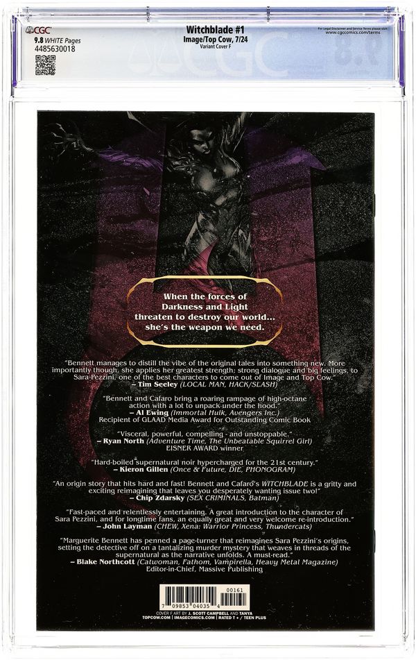 Limited 1 for 50 Retailer Incentive Variant Cover. Written by Marguerite Bennett. Art by Giuseppe Cafaro and Arif Prianto. Cover by J. Scott Campbell. Series Premiere. Sara Pezzini is back in an all-new origin story! A reimagining of the classic storyline, this high-octane supernatural thriller starts at the beginning with familiar characters and new story arcs. New York City Police Detective Sara Pezzini's life was forever fractured by her father's murder. Cold, cunning, and hellbent on revenge, Sara now stalks a vicious criminal cabal beneath the city, where an ancient power collides and transforms her into something wild, magnificent, and beyond her darkest imaginings. From co-creator Marc Silvestri (The Darkness, Cyber Force, Batman and the Joker: The Dearly Duo) and writer Marguerite Bennett (Animosity, Batwoman, DC Bombshells) with artist Giuseppe Cafaro (Suicide Squad, Power Rangers, Red Sonja) comes a bold new era of Witchblade! 48 pages, full color. Rated T+ Cover price $4.99.