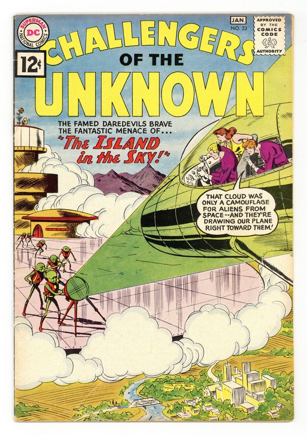 First 12-cent cover price. "Death Guarded the Doom Box." The Challengers face a series of traps and obstacles while attempting to thwart a criminal intent on landing a wizard's deadly device. "The Island in the Sky." Two alien scientists warn the Challengers about Zog, a villain who has stolen a sky platform. Art and cover by Bob Brown. Cover price $0.12.