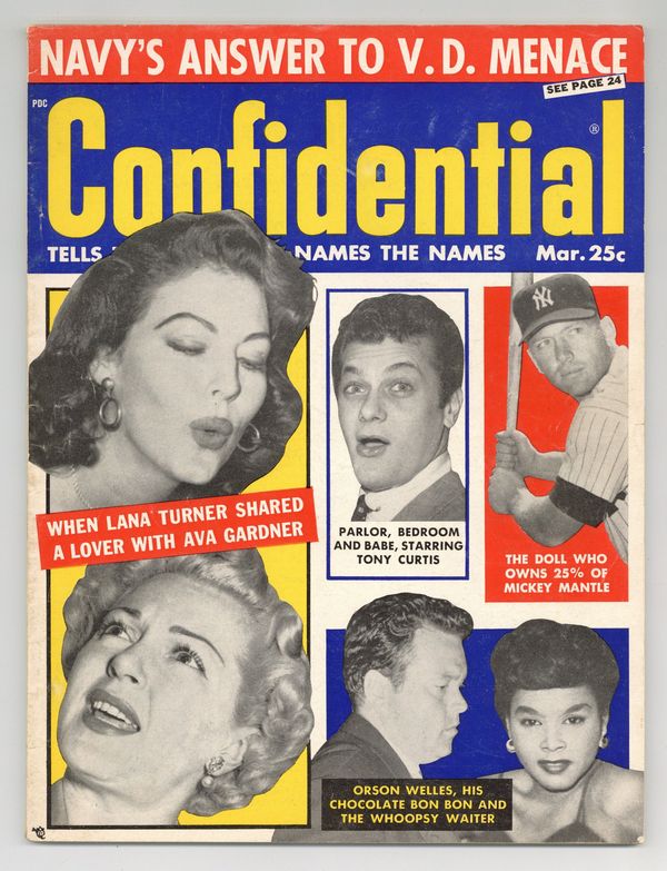 Pioneering magazine by Robert Harrison featuring scandalous stories about the personal lives of celebrities and other well-known individuals. Lana Turner, Ava Gardner, Tony Curtis, Mickey Mantle, Orson Welles photo cover. 8 1/2-in. x 11 1/4-in., 68 pages, black and white. Cover price $0.25.