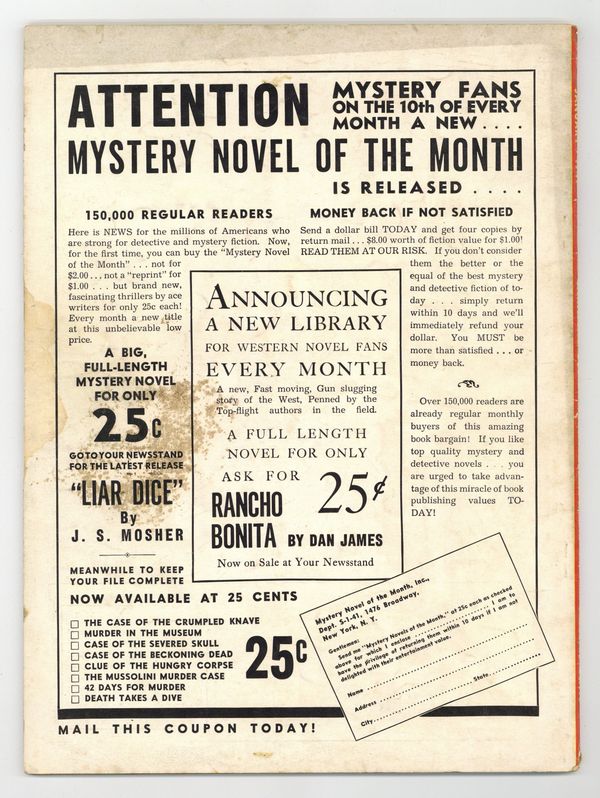 Published Sep 1950 by Fox Feature Syndicate.$53.00- 9" cumulative spine split. Cover oxidation. Water damage