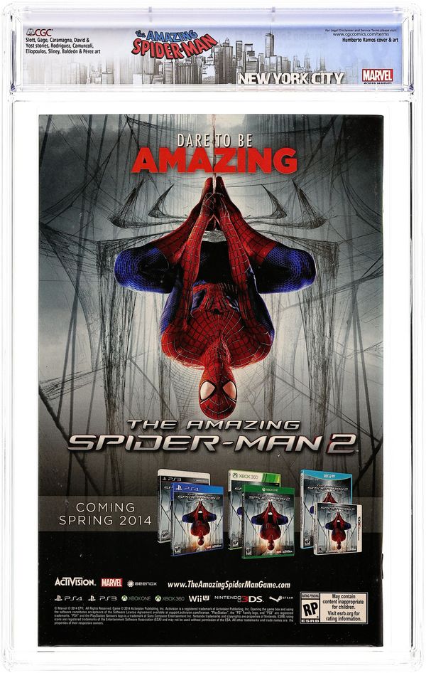 Written by Dan Slott, Christos Gage, Christopher Yost, Joe Caramagna and Peter David. Art by Humberto Ramos, Javier Rodriguez, Will Sliney, Giuseppe Camuncoli, Chris Eliopoulos, David Baldeon, Ramon Perez and Victor Olazaba. Cover by Humberto Ramos. The Greatest Super Hero of All Time RETURNS!The world may have changed since Spidey's been gone, but so has Peter Parker. This is a man with a second chance at life, and he's not wasting a moment of it. Same Parker Luck, new Parker attitude. Putting the "friendly" back in the neighborhood, the "hero" back into "super hero," and the "amazing" back into "Spider-Man!" Also returning: The recharged and reenergized ELECTRO! 96 pages, full color. Cover price $5.99.