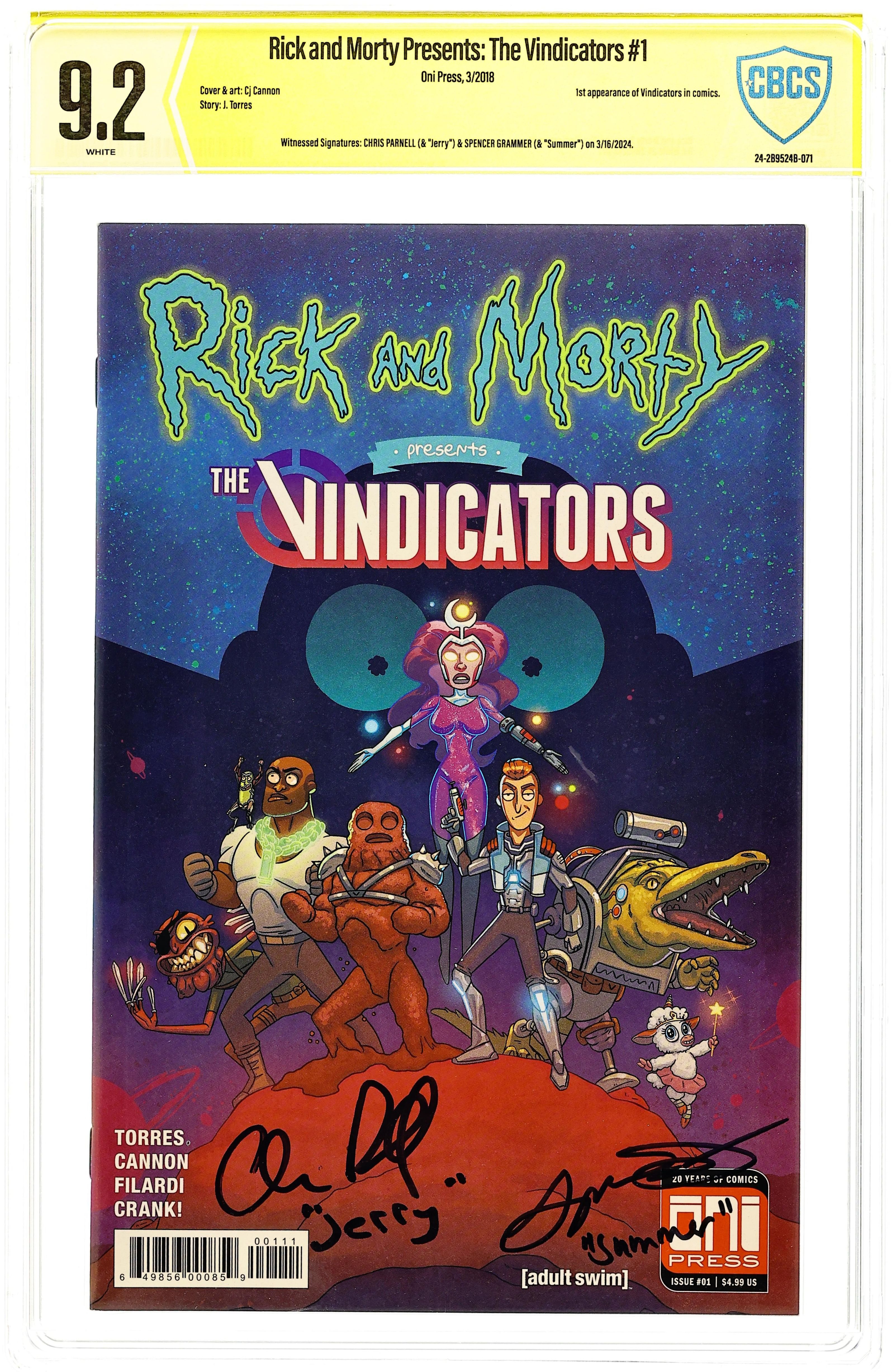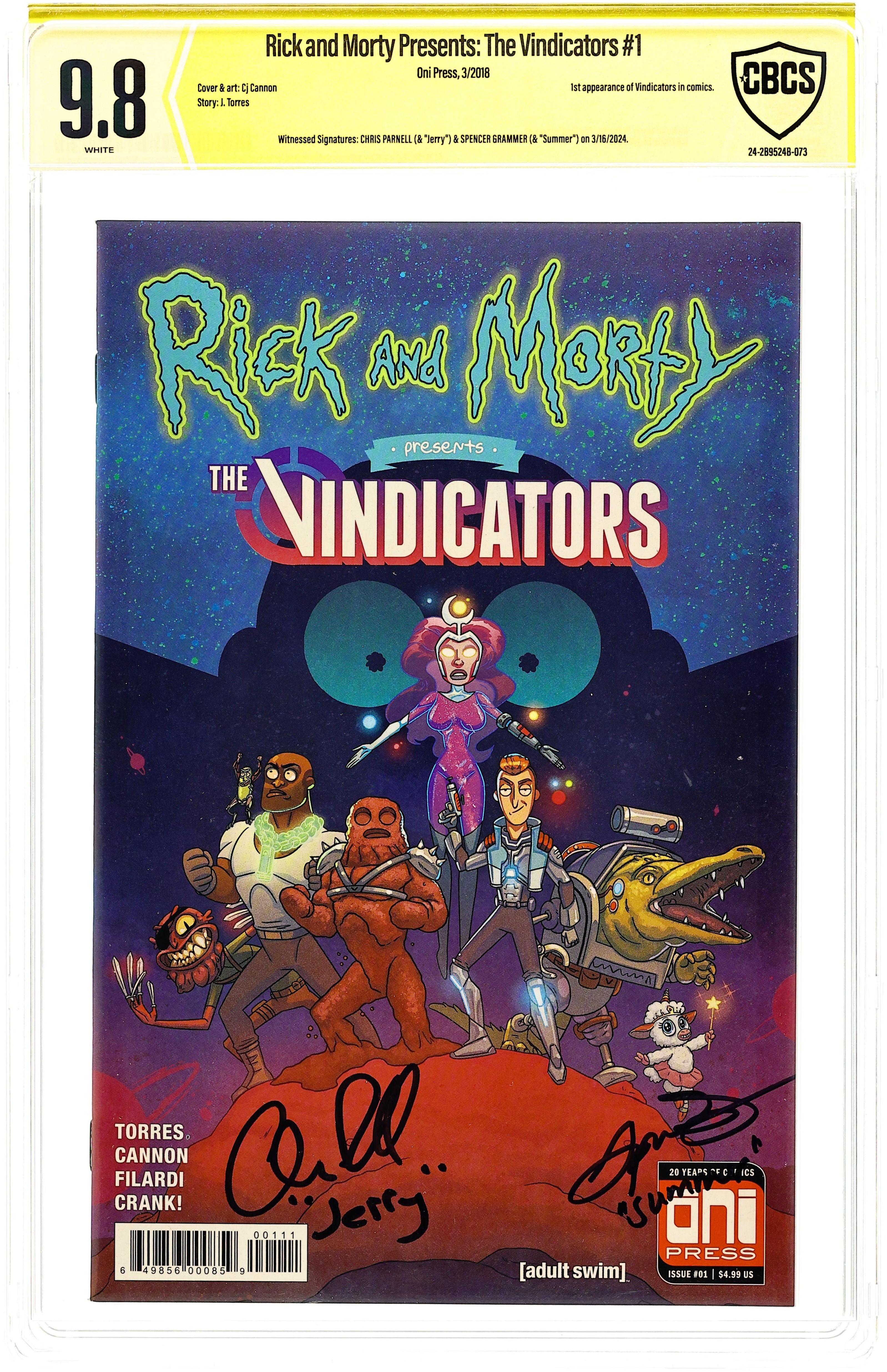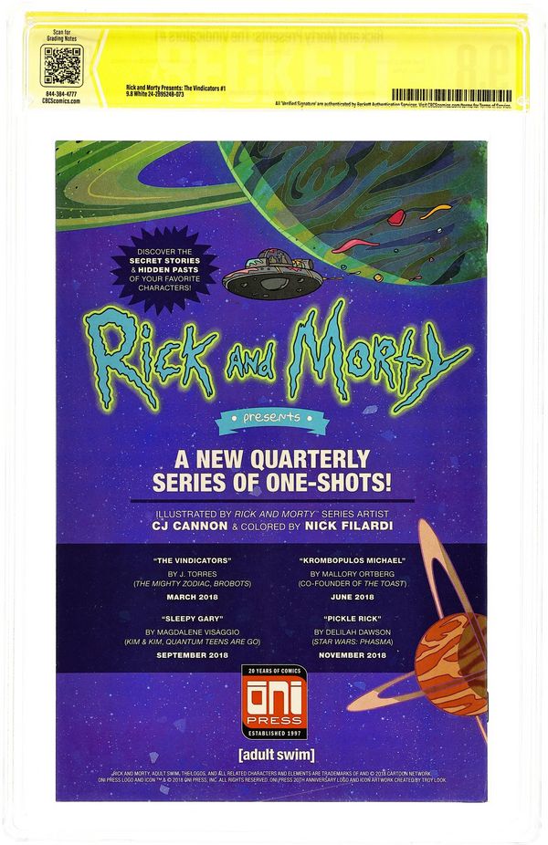 2nd Printing. Written by J. Torres. Art and Cover by CJ Cannon and Nick Filardi. Learn the secret stories and hidden pasts of your favorite Rick and Morty characters in Oni Press's new quarterly series of one-shots: RICK AND MORTY PRESENTS! In this first issue, J. Torres (Teen Titans Go!, The Mighty Zodiac) teams up with Rick and Morty series artist CJ Cannon to explore the twisted and bombastic history of THE VINDICATORS in an all-out superhero comics extravaganza. Read in amazement as the superhero team travels through dimensions to recruit other heroes to defeat a villain of their own making. Gasp in shock and awe as the plot twists and previously irrelevant characters revive from the dead! Frown in frustration as you forget the complicated backstory of suddenly important mythic items! 36 pages, full color. Cover price $4.99.