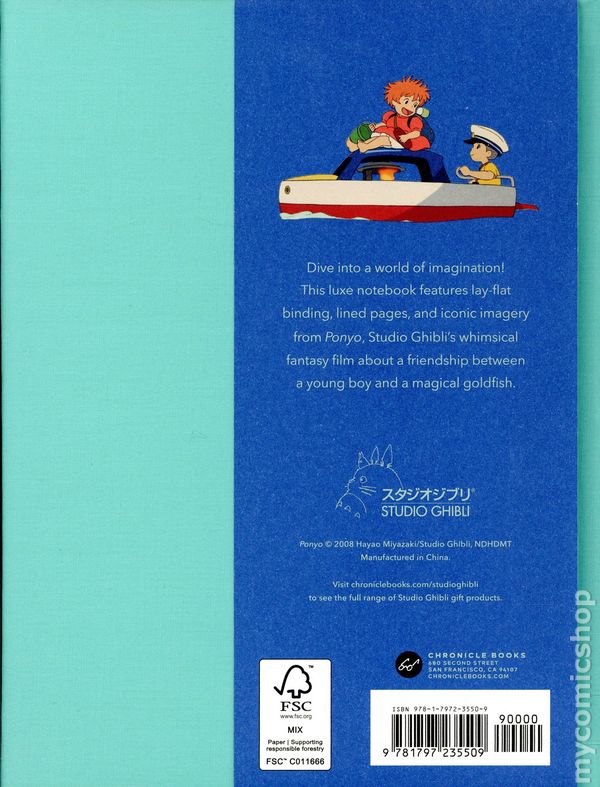 1st printing. Dive into a world of imagination! This luxe notebook features iconic imagery from Ponyo, Studio Ghibli's whimsical fantasy film about a friendship between a young boy and a magical goldfish with a cloth-bound, foil-stamped case, lined pages, and lay-flat binding, this notebook invites you to let your creativity flow! Perfect for writers, notetakers, collectors, and animation fans alike. Hardcover, 6-in.x 8-in., 128 pages (Blank Lined Pages), B&W. Cover price $18.95.