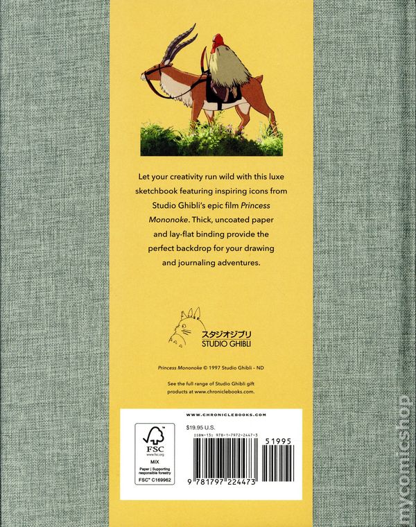 2nd and later printings. Let your creativity run wild with this luxe sketchbook featuring inspiring icons from Studio Ghibli's Princess Mononoke, an epic film about a noble warrior, a young girl raised by wolves, and the pursuit of peace between humanity and nature. Featuring a cloth, foil-stamped cover, lay-flat binding, and extra-thick pages, the Princess Mononoke Sketchbook provides a one-of-a-kind backdrop for your drawing and journaling adventures. This is the perfect canvas for writers, artists, collectors, and animation fans alike. Hardcover, 7-in. x 9-in, 128 Blank pages. Cover price $19.95.