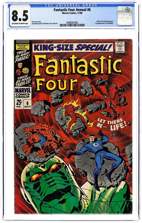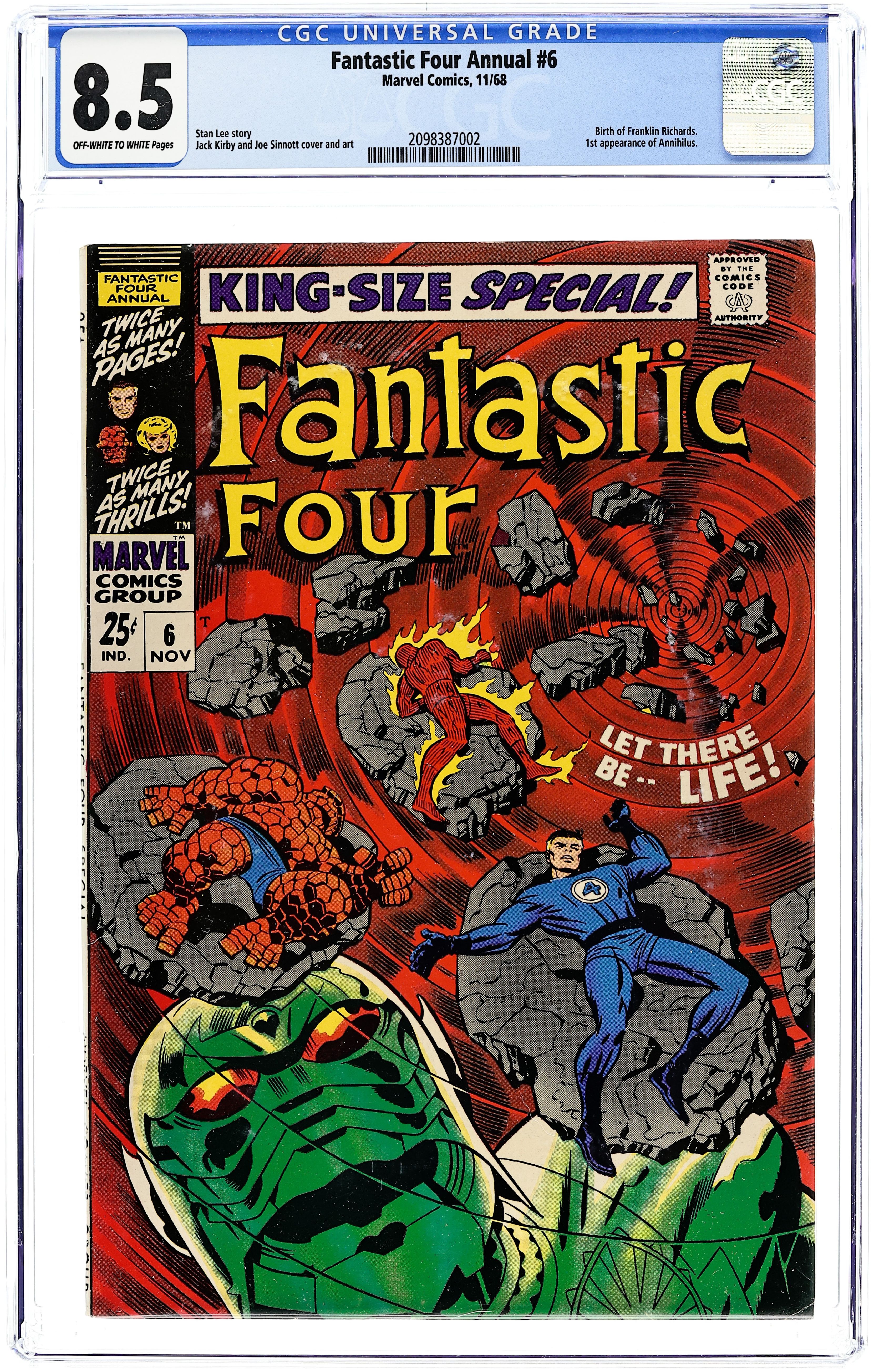 1st appearance of Franklin Richards and 1st appearance of Annihilus - "Let There Be Life!" Script by Stan Lee, pencils by Jack Kirby, inks by Joe Sinnott. Kirby/Sinnott cover. Franklin Richards is born and Annihilus is introduced! 68 pgs. Cover price $0.25.