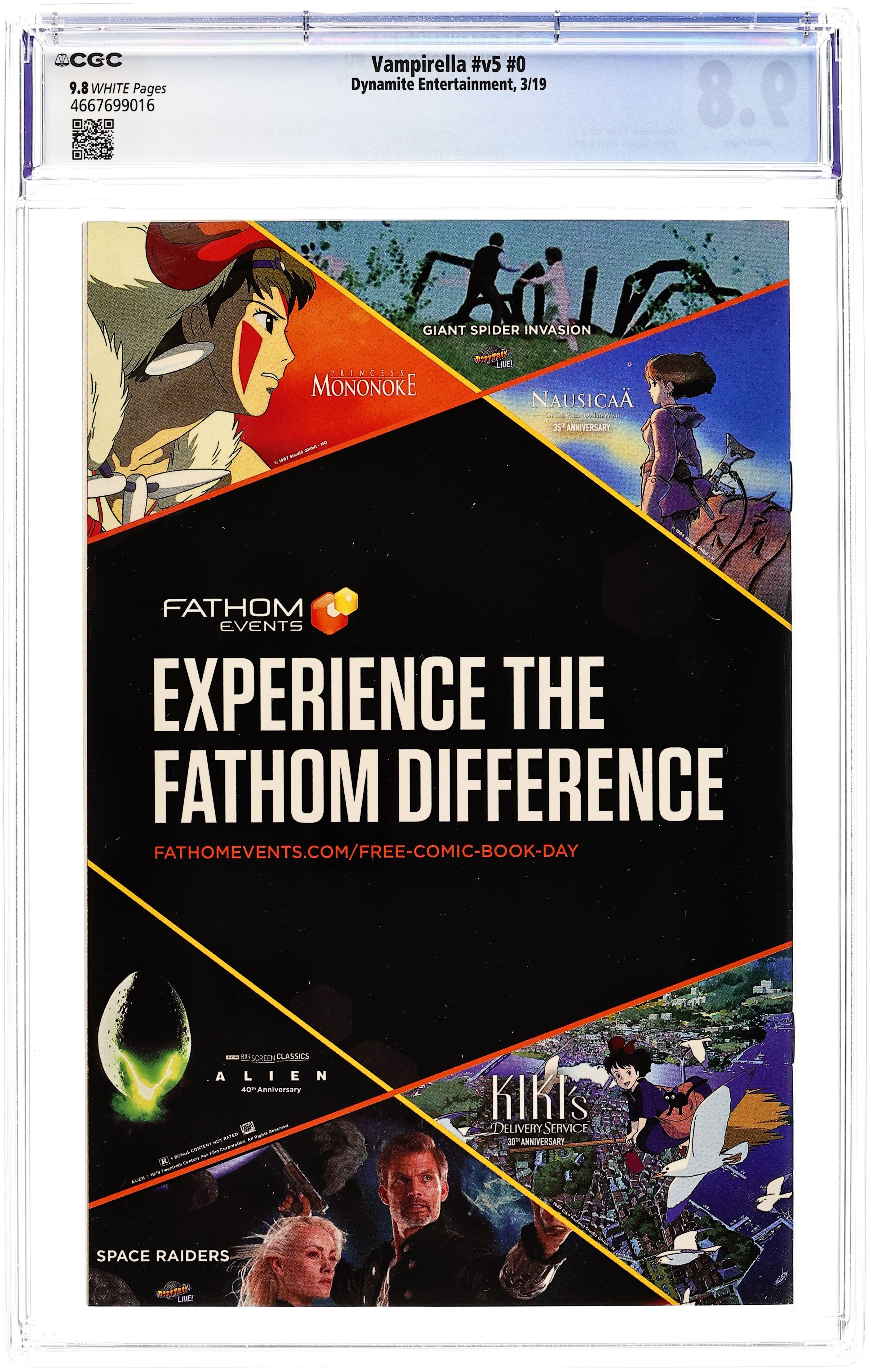 Cover by Ergün Gündüz. Written by Christopher Priest and Kurt Busiek. Art by Ergün Gündüz and Arthur Adams. July 2019 is the 50th anniversary of Vampirella and to celebrate, Dynamite is relaunching the title that very month, with a very special preview in this year's FCBD special, Vampirella #0! This zero issue unveils our lights-out new creative team as they present the prologue to a story so big, we had to hold it for Vampi's birthday! Featuring: "Disciple" by Christopher Priest and Ergün Gündüz. Plus: "Bugs" by Kurt Busiek and Arthur Adams, reprinted from Creepy 1993 Fearbook (1993) #1. 32 pages, full color. Rating: Teen+