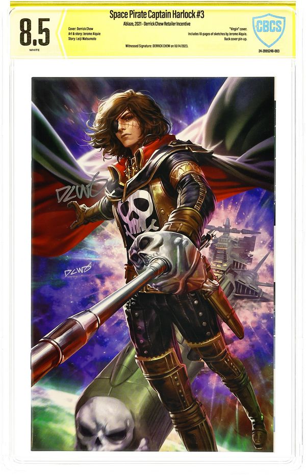Limited 1 for 10 Retailer Incentive Variant Cover. Written by Leiji Matsumoto, Jerome Alquie. Art by Jerome Alquie. Cover by Derrick Chew. Harlock and the Arcadia race against the clock and around the Earth to find anyone who can help them face the newly unleashed Mazon threat head-on and prevent the planet's destruction before the enemy fleet even arrives! 32 pages, full color. Rated T Cover price $3.99.