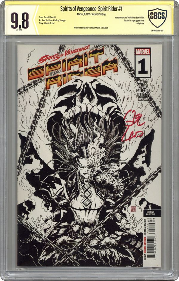 2nd Printing. Written by Taboo, B. Earl. Art by Paul Davidson and Jeffrey Veregge. Cover by Takashi Okazaki. SHE'S LIKE NO GHOST RIDER YOU'VE EVER SEEN! SHE IS KUSHALA - A SORCERER SUPREME, A SPIRIT OF VENGEANCEā¦AND THE SAVIOR OF JOHNNY BLAZE'S SOUL! Blaze has been through a lot lately, from ascending the throne of Hell to nearly murdering his former allies on the Avengers. But his nightmare is far from over. Something - or someone - is haunting him, and only a Ghost Rider with the powers of a Sorcerer Supreme can find out why. The dynamic writing duo of Taboo (of the Black Eyed Peas) and B. Earl expand the Rider mythos with an action-packed special that will kick off a brand-new era of vengeance! Kushala's about to be the hottest thing in hell. 36 pages, full color. Rated T+ Cover price $4.99.