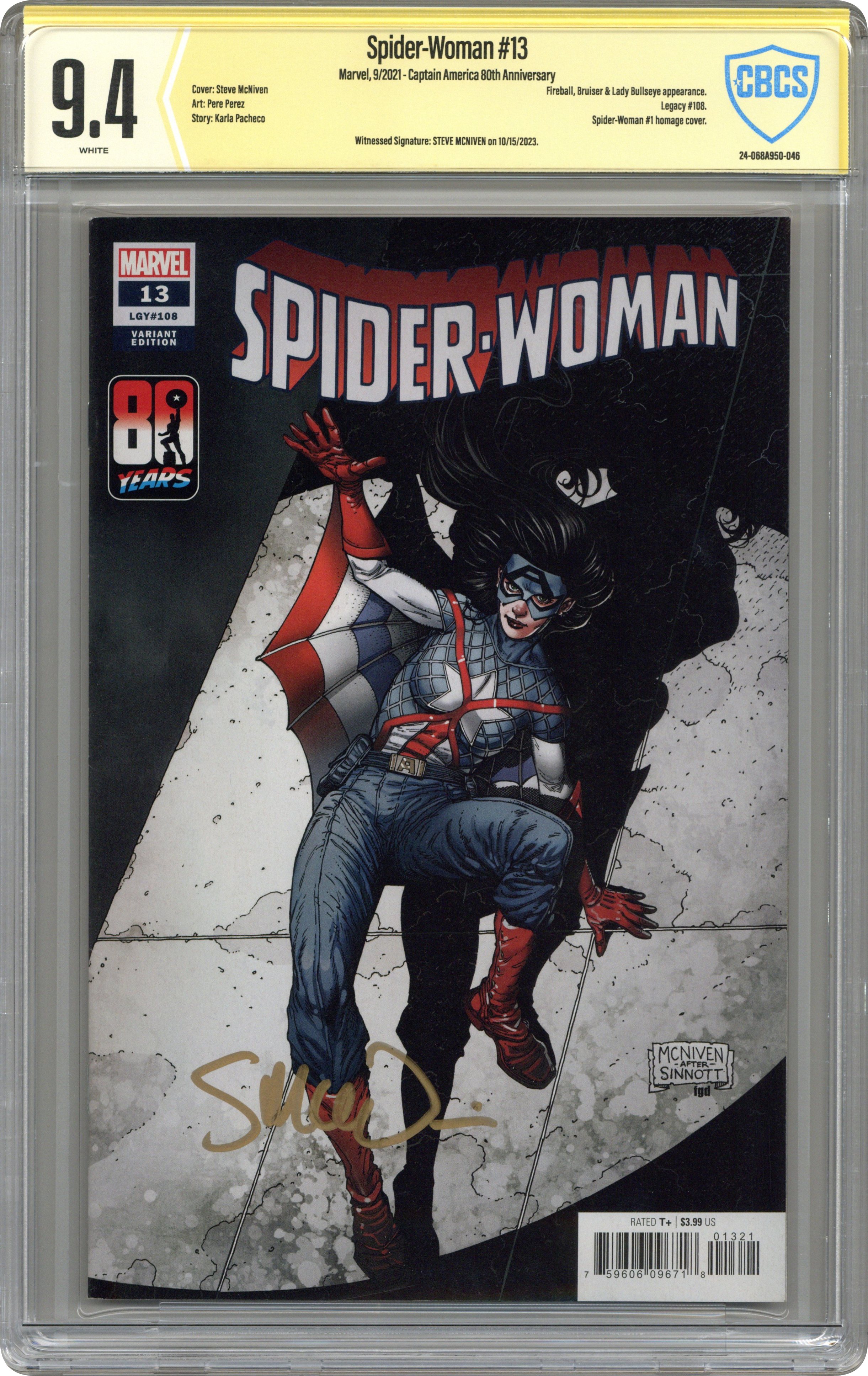 - Captain America 80th Anniversary. Witnessed Signature: Steve McNiven on 10/15/2023.