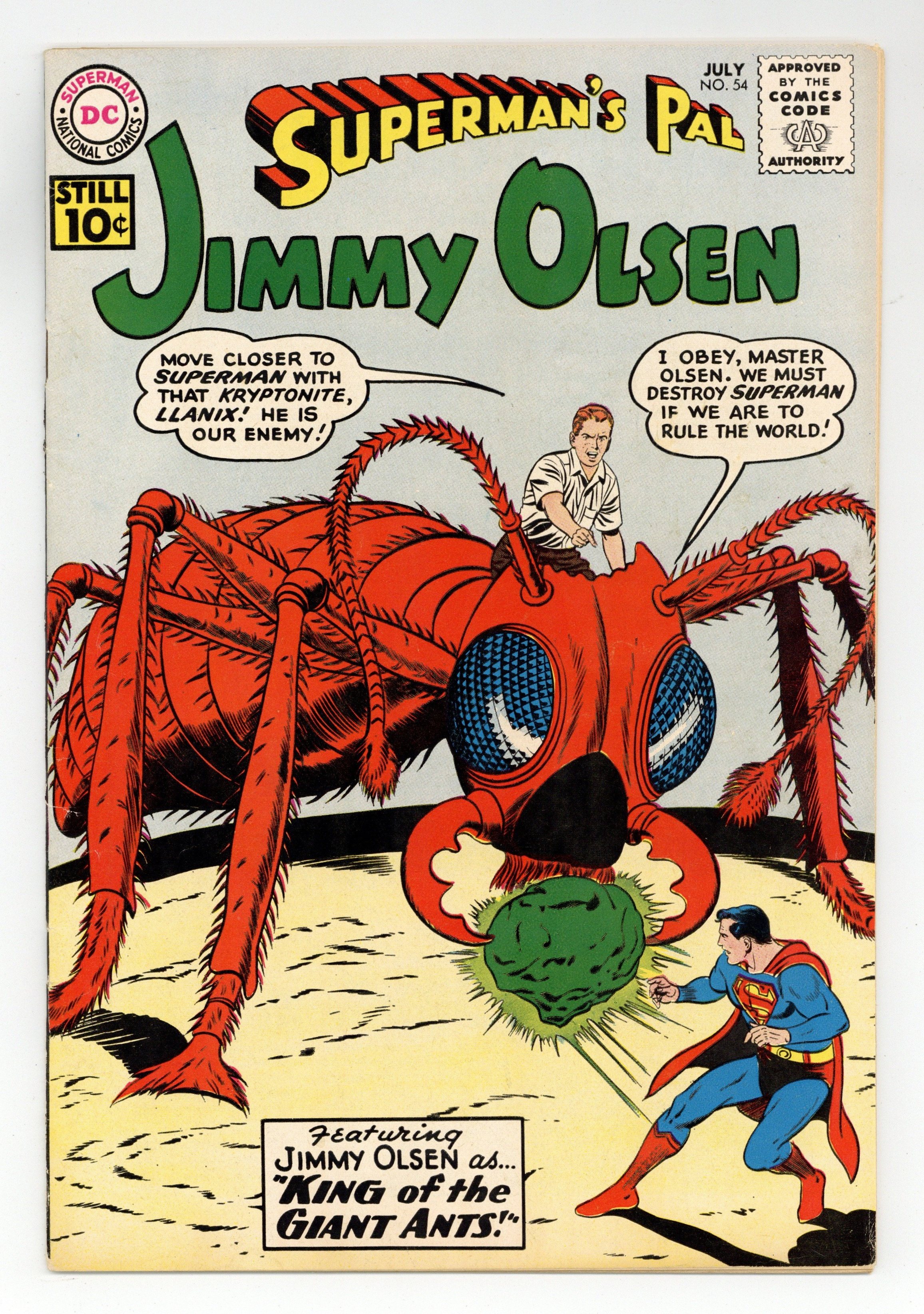 Cover pencils by Curt Swan, inks by Ray Burnley. Jimmy Olsen's Martian Pal; Jimmy appears to be getting signals from Mars on his ham radio set. Jimmy Olsen's Forgotten Adventure; Jimmy disguises himself as Dick Hunter, elevator boy, then gets amnesia and forgets who he really is. Jungle Jimmy Olsen; Clark and Jimmy go to the Yucatan searching for a mysterious "jungle boy". Scripts by Otto Binder, pencils by Curt Swan, inks by Ray Burnley. Do You Know How to Be a Good Baby-Sitter? public service announcement starring Buzzy, script by Jack Schiff, art by Win Mortimer. How to be a Weather Expert article by Jack Miller [as John Maxon]. 36 Pages, Full Color. Cover price $0.10.