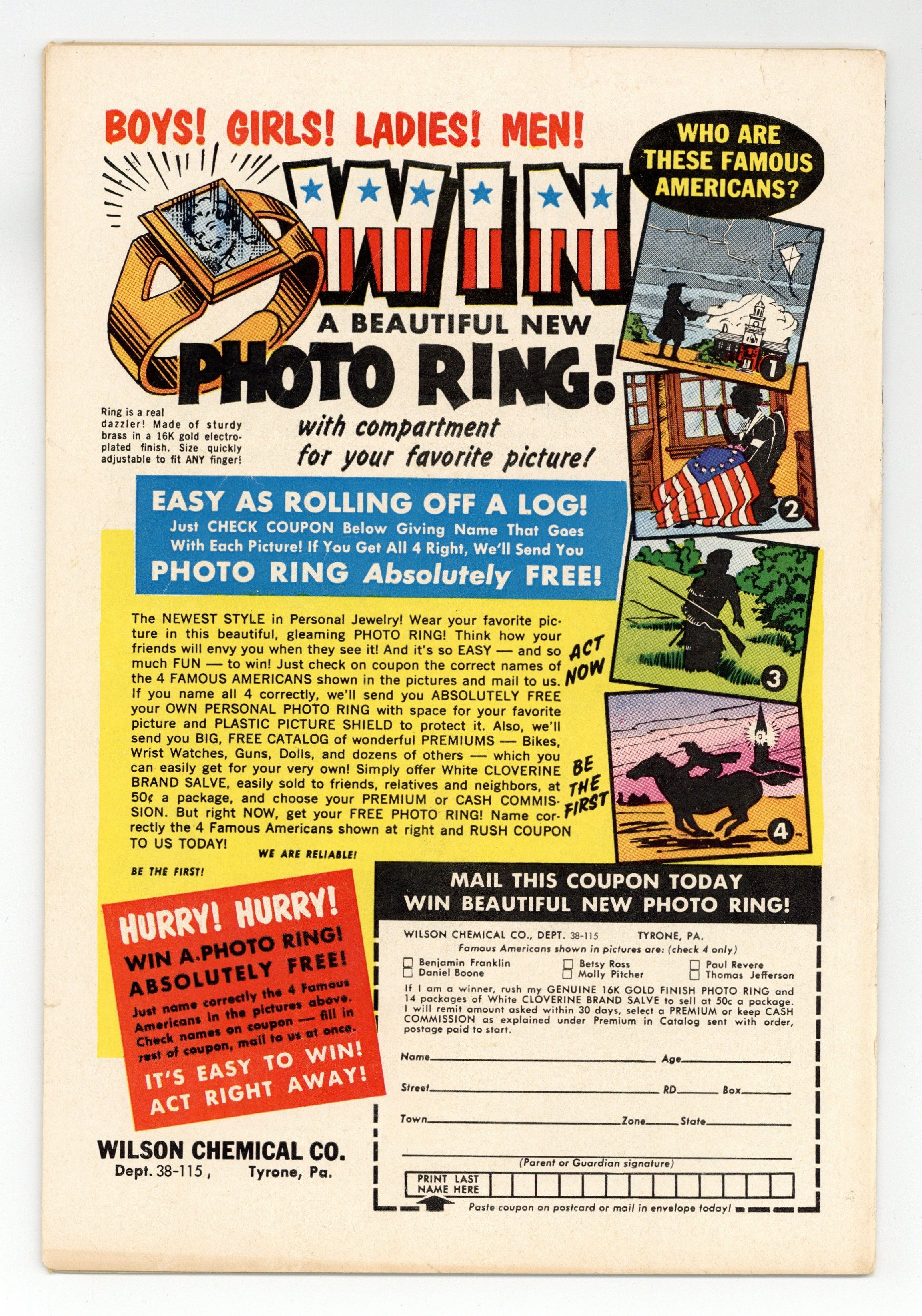 Tags: Superman$47.00Cover pencils by Curt Swan, inks by Ray Burnley. Jimmy Olsen In the 50th Century; Superman and Jimmy go up in rocket, and Jimmy ends up in the far future. The Case of the Cartoon Scoops; Jimmy's cartoon drawings of Superman predict the future. The Radioactive Boy; Jimmy thinks he's dying from radiation poisoning. Scripts by Otto Binder, pencils by Curt Swan, inks by Ray Burnley. Gifts to the United Nations! public service announcement, script by Jack Schiff, art by Ruben Moreira. Shorty humor page by Henry Boltinoff. Wrath of the White Waters text story by Jeb MacKay. 36 Pages, Full Color. Cover price $0.10.