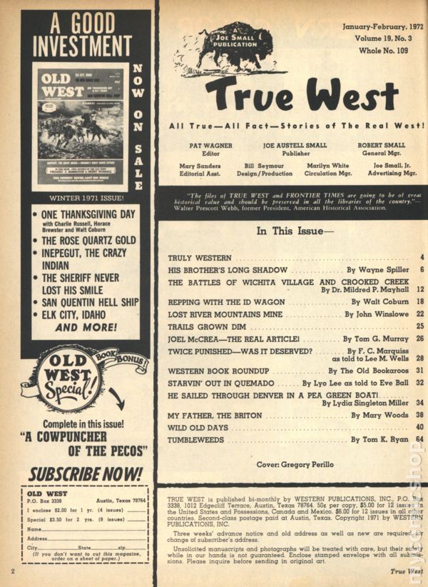 72 pgs. B&W. Color cover. Non fiction magazine of western stories. Features art and photos. Cover price $1.00.