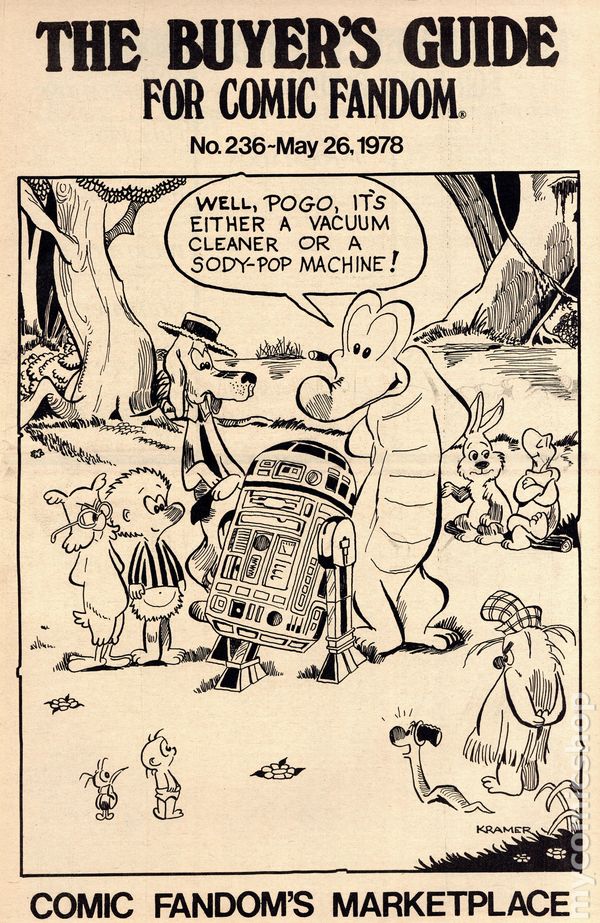 NO Mile High catalog. The Buyers Guide for Comic Fandom #236, May 26, 1978. The core issue has four sections and 88 pages, and originally included an extra two-section, tabloid-sized, 32-page Mile High Comics catalog. In total, for this issue to be complete, there should be six sections and 120 pages. Inside, the issue features a TBG Cartoon Caption Contest by Keith von Cannon; a Crusader Comments column by Martin L. Greim; and the final installment of The Boston Butchers comic strip by Al Bradford. The great R2-D2/Pogo and his pals cross-over cover is by Ken Kramer. Summary of this issue by Russ Maheras.