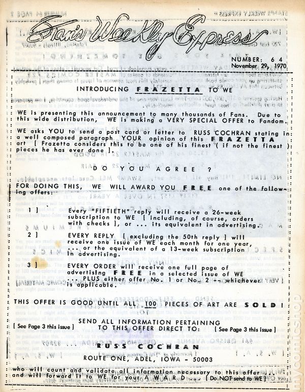 Stan's Weekly Express (or WE, for short) was a weekly adzine published from 1969 to 1973 by Stanley Blair of Houston, Texas. It was a direct forerunner of the Comics Buyer's Guide. Blair founded the WSA (short for Stan's Weekly Express Seal of Approval) to serve as a guard against mail fraud for the blossoming comic fandom industry. (Thanks to http://www.comicbookfanthropology.com and http://en.wikipedia.org/wiki/Comics_Buyer's_Guide for the above information!) This September, 1972 double-issue is the first WE printed after Blair had his stroke. Features a four page story entitled "I Dig You, Dr. Frankenstein Baby!" by pulp fiction historian Nick Carr, which narrates Carr's trip to Germany and the castle of Dr. Berg Frankenstein; and a three page piece called "A Few Suggestions for the New Collector," by Robert Samson, in which Mr. Samson boldly states, "The collector's items of 1991 are on sale today!" Also featured is a full-page ad for "All in Color for a Dime," Dick Lupoff's and Don Thompson's classic collection of fandom musings.
