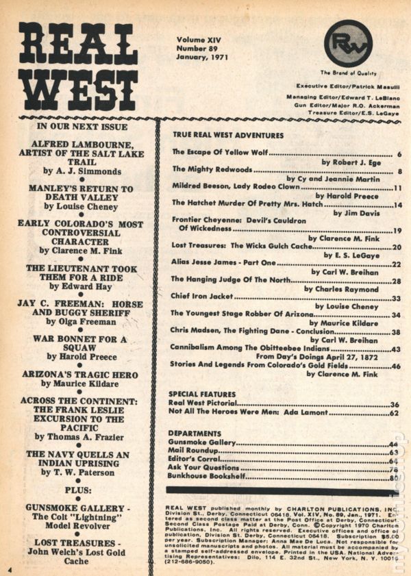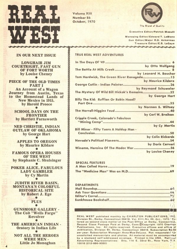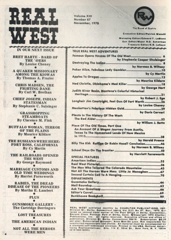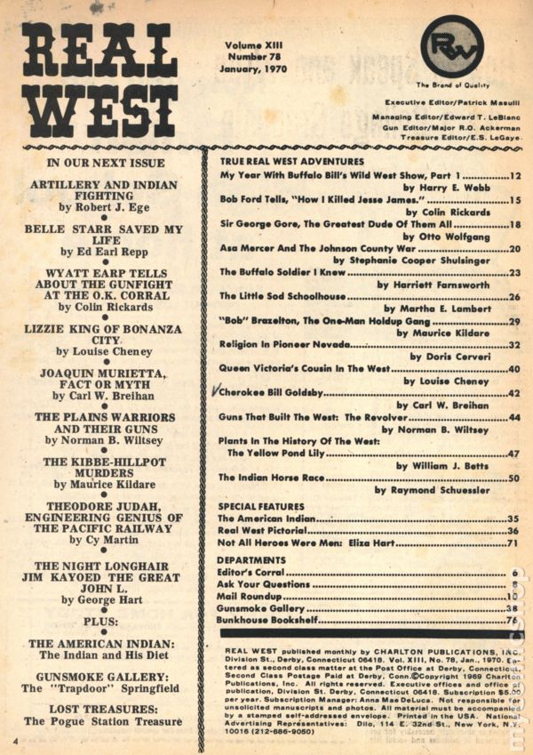 Magazine of true stories of the American Frontier. Features illustrations and photos of the old west. 8.25-in. x 10.75-in. 82 pages. B&W text. Color cover. Cover price $0.50.