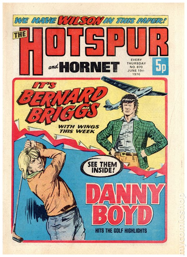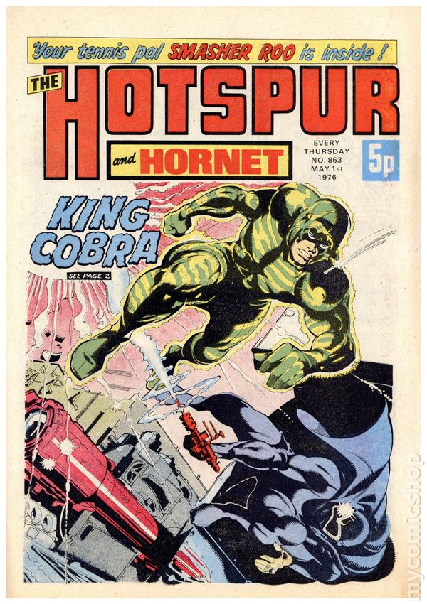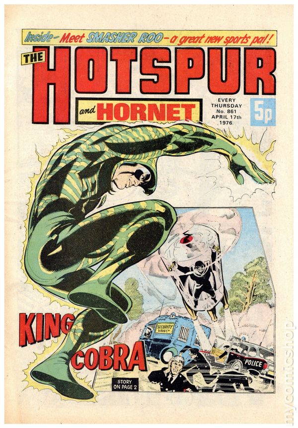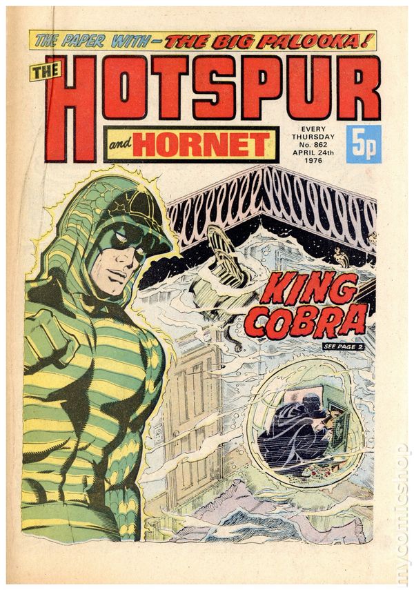 Hotspur and Hornet - April 17th, 1976. Stories include: King Cobra, Smasher Roo, The Big Palooka, Danny Boyd Golf Star in the Making, Wilson's Wonders, Napper Todd, Outlaws of the Sacred Sword, Bernard Briggs, and The Blockbusters. 8 1/4" x 12", 32 pages, PC/PB&W, 5p cover price.