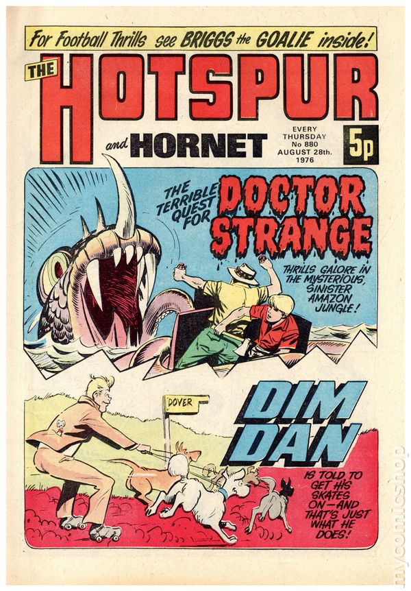 Hotspur - September 25th, 1976. Stories include: Sputnik, Outcasts of the Olympics, Dim Dan, Cameron R.N., The Terrible Quest for Doctor Strange, The Goals Nobody Cheered, Charlie Perks, Death Guards the Hoodoo Gold, Briggs the Goalie, and Ossie the Outlaw. 8 1/4" x 12", 32 pages, PC/PB&W, 5p cover price.