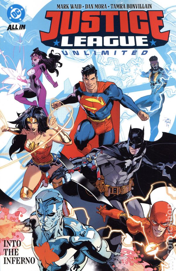 Volume 1 - 2nd and later printings. "Into the Inferno!" Collects Justice League Unlimited (2024 DC) #1-6. Written by Mark Waid. Art and cover by Dan Mora. A NEW ERA OF THE JUSTICE LEAGUE STARTS HERE! When evil threatens the world, the Justice League is there to help! No matter how many crises there are or foes to be fought, Earth is protected by the Watchtower in the sky, sending teams of heroes wherever they're needed. Now, a terrible threat known as Inferno has arisen, taking many forms as it seeks to spread destruction all around the globe. Will the Justice League find the key to stopping Inferno in time? Or will they be betrayed by one of their own? In the aftermath of Absolute Power comes a stronger Justice League, united together and with unlimited strength. Brought to you by the tremendous team of Mark Waid (Superman: Action Comics, Batman/Superman: World's Finest) and Dan Mora (Absolute Power, Adventures of Superman: Jon Kent)! Softcover, 160 pages, full color. Teen Cover price $17.99.
