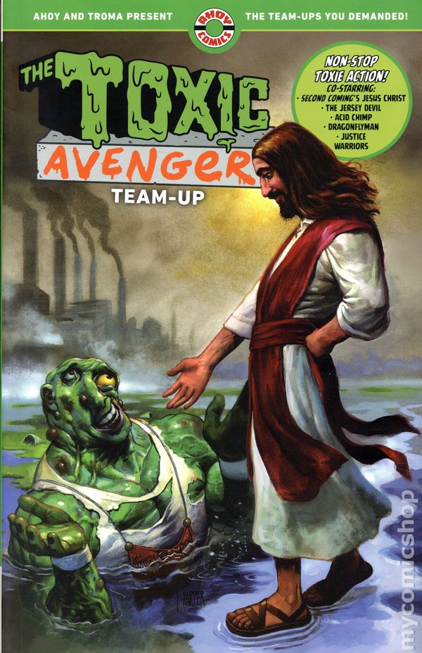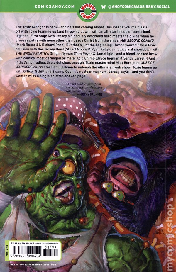 1st printing. Written by Mark Russell, Stuart Moore, Bryce Ingman, Tom Peyer, Matt Bors, and Ben Clarkson. Art by Richard Pace, Ryan Kelly, Sandy Jarrell, Jamal Igle, and Ben Clarkson. Cover by Fred Harper. With a new film and a long-awaited video game in 2025, the Toxic Avenger is hot! This outrageous volume teams the monster-hero with some of comics greatest and most controversial superstars, including Jesus Christ, the Son of God. THE TOXIC AVENGERs graphic novel hit stores like a rocket in 2025, and this companion volume sees the hero from New Jersey meet up with a surprise lineup of comic stars. First up: Jesus Christ from the hit series SECOND COMING, by that series creative team, Mark Russell and Richard Pace! Other clashes include the dystopian cops called JUSTICE WARRIORS, by Toxie mastermind Matt Bors and Ben Clarkson; the Garden States other monster, the Jersey Devil; Dragonfly, from THE WRONG EARTH; and that homicidal simian, Acid Chimp. Softcover, 128 pages, full color. Cover price $17.99.