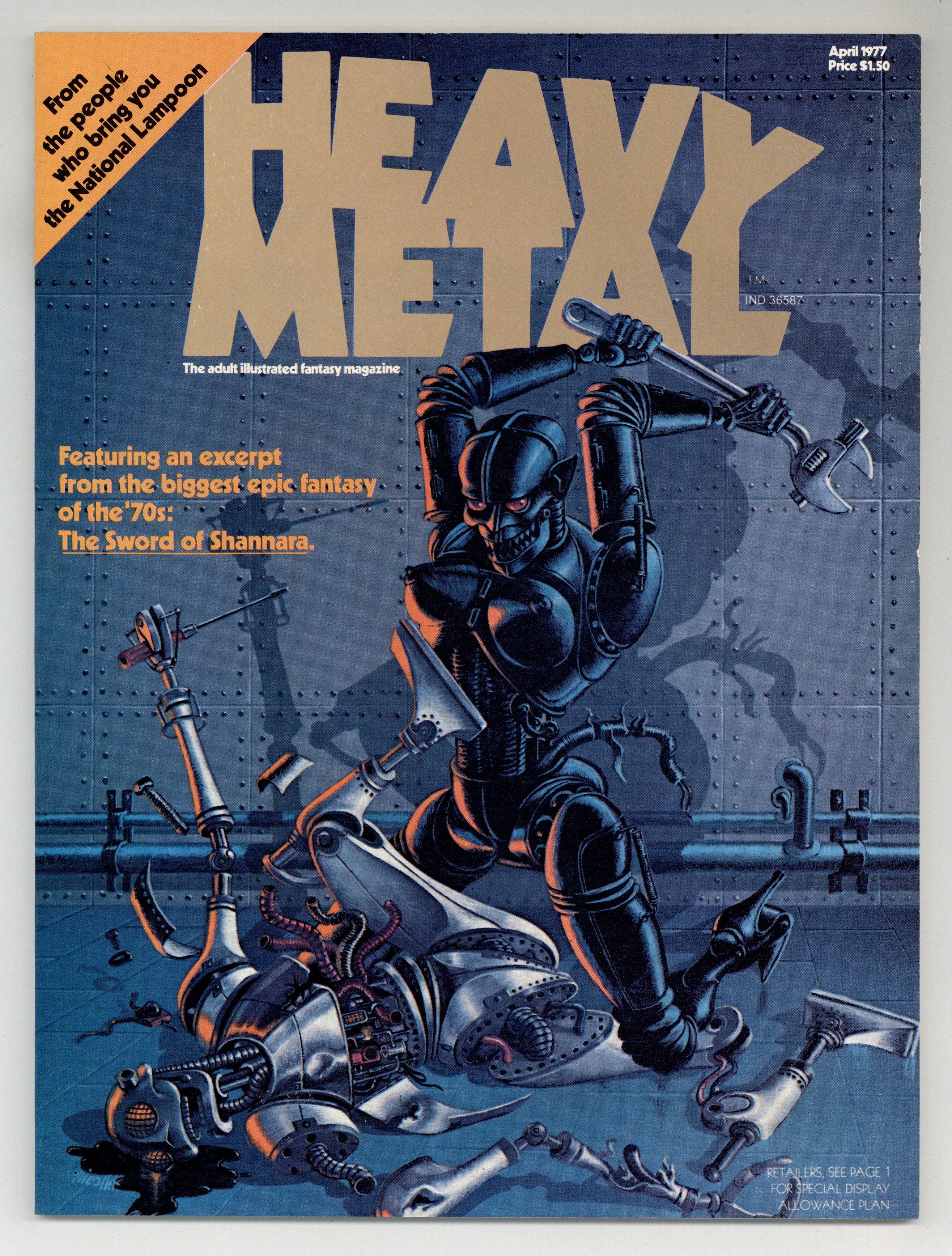 Rich Corben, Moebius, & Bode art April, 1977, issue 1. Dubbed "The adult illustrated fantasy magazine," Heavy Metal also publishes tales of horror, science fiction, and adventure. This first issue includes the following stories: Den by Richard Corben; Rut by Druillet; Conquering Armies by Dionnet and Gal; The Adventures of Yriss by Druillet and Alexis; Azrach by Moebius; Selenia by Marre and Macedo; The Sword of Shannara by Terry Brooks; Traumwach by Mouchel, Pierson, and Voss; Space Punks by Mezieres; Age of Ages by Rubington; 1996 by Montellier; Sunspot by Vaughn Bodé; and Manipulation by Roy. Cover art by Nicollet. Cover price $1.50.