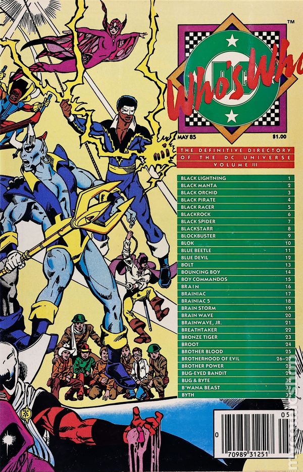 Newsstand Edition. Written primarily by Len Wein and Marv Wolfman (with research by E. Nelson Bridwell and others), Who's Who is a meticulously detailed, alphabetically arranged series of reference volumes that provides personal data, history, and powers and weapons for countless DC characters, both popular and obscure, both new (circa mid 1980s) and old. Volume three has entries for Black Lightning, Blue Beetle, Boy Commandos, Brainiac, and many others. Character renderings are by such artistic greats as Gil Kane, George Perez, Jim Aparo, Curt Swan, Jack Kirby, Michael T. Gilbert, and Steve Rude. FULL DETAIL: 3 - Character/artist listing: Black Lightning by Jim Aparo; Black Manta by Bill Willingham and Romeo Tanghal; Black Orchid by Terry Austin; Black Pirate by Jerry Ordway; Black Racer by Jack Kirby and Greg Theakston; Blackrock by Curt Swan and Murphy Anderson; Black Spider by Pat Broderick; Blackstarr by Carmine Infantino and Rick Magyar; Blockbuster by Michael T. Gilbert; Blok by Steve Lightle; Blue Beetle by Steve Rude; Blue Devil by Paris Cullins and Gary Martin; Bolt by Paris Cullins and Gary Martin; Bouncing Boy by Keith Giffen and Karl Kesel; Boy Commandos by Jack Kirby and Greg Theakston; Brain by Bill Sienkiewicz; Brainiac by Ed Hannigan and Mike DeCarlo; Brainiac 5 by Curt Swan and Karl Kesel; Brain Storm by Curt Swan and Al Williamson; Brain Wave by Joe Staton; Brainwave Jr. by Jerry Ordway; Breathtaker by Rafael Kayanan; Bronze Tiger by Denys Cowan and Frank Giacoia; Broot by Shawn McManus; Brother Blood by George Perez; Brotherhood of Evil by George Perez; Brother Power by Valentino and Karl Kesel; Bug-Eyed Bandit by Gil Kane; Bug & Byte by Rafael Kayanan and Bob Smith; B'Wana Beast by Chuck Patton and Rick Magyar; Byth by Joe Kubert. George Perez/Dick Giordano cover. Cover price $1.00.