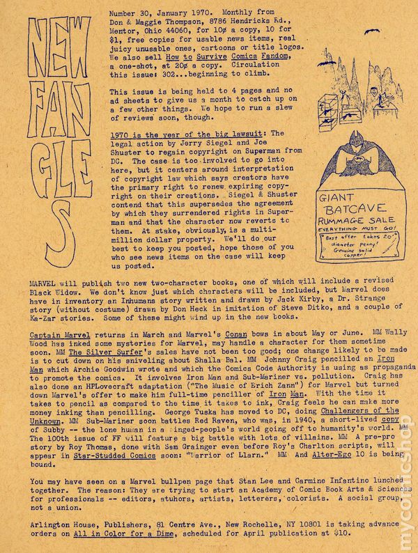 News zine published by Don and Maggie Thompson. This was an extra 2 page addendum titled "Number 33, second March 1970 issue" announcing the big news of Jack Kirby leaving Marvel Comics and heading over to DC Comics, also news of a Denny O'Neil and Neal Adams Vampirella story, and more . 2 pages. Circulation 300. Cover price $0.10.