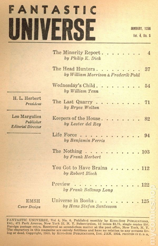 Vol. 4, No. 6 - January , 1956. 5.5" x 7.5", 128 pages, B&W. Features Philip K. Dick's story Minority Report, which was adapted for film in 2002. Cover price $0.35.