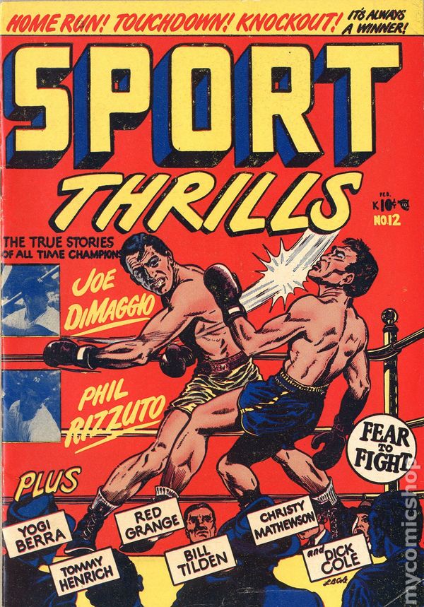 Cover by L. B. Cole. True-life tales of sporting greats, and stories about athletic people. MVP, All-Star and cultural icon, Joe Dimaggio is widely considered one of the greatest baseball players of all time. (This issue was published before his marriage to Marilyn Monroe.) Yogi Berra comes to be regarded as one of the greatest catchers in baseball history, as well as a widely quoted armchair philosopher. Also featuring biographies of Phil Rizzuto, Tommy Henrich, Red Grange, Bill Tilden and Christy Matthewson. Fear to Fight; Christy Matthewson; Red Grange the Galloping Ghost. 32 pages, Full Color. NOTE: There is also a #12 "Accepted" reprint edition. In the reprint edition, the "Accepted" logo appears in upper left corner of cover. Cover price $0.10.