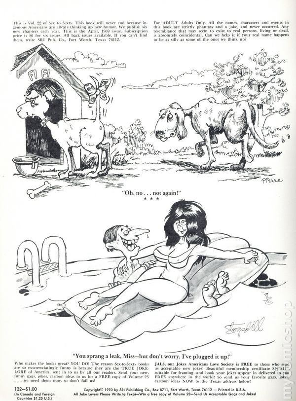 "Sex to Sexty: Laff Clinic!" Men's Magazine with adult jokes and cartoons. Cover by Denis Jones. Cartoons by Glen Bernhardt, Al Kaufman, George Ludway, George Troop, Bob Tupper, Bill Wenzel, and many others. 64 pages, text, with B&W illustrations Cover price $1.00.