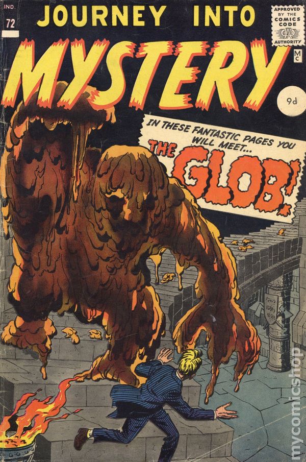 Cover pencils by Jack Kirby. "The Glob," pencils by Jack Kirby, inks by George Klein; A painter is hired to cover a statue with strange paint; The statue comes to life at midnight and goes on a rampage. "The Sorcerer" text story, art by Joe Maneely. "The Patient in Room 3D," art by Paul Reinman; Doctors perform an operation to increase brain power, hoping to find an answer to the world's problems, but the patient is still not intelligent enough to solve them. "Will This Be the End of the World?," art by Steve Ditko; A baseball player's mitt is infested with tiny humans with enough rockets to evacuate their entire world as they see the baseball hurling towards them. 36 pgs., full color. -