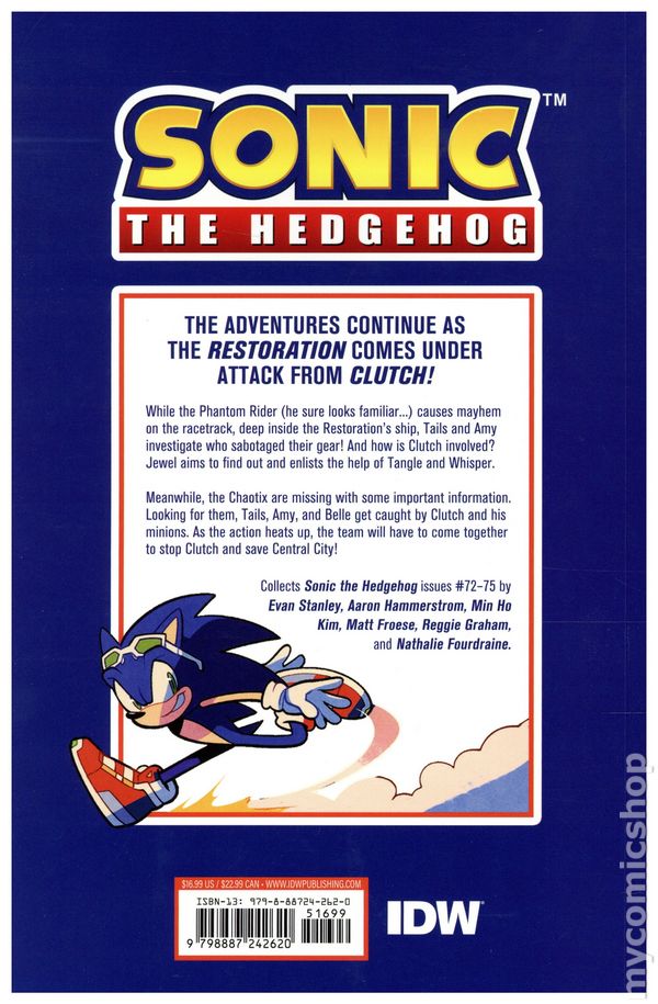 Volume 19 - 1st printing. "Collision Course!" Collects Sonic The Hedgehog (2018 IDW) #72-75. Written by Evan Stanley. Art by Aaron Hammerstrom, Min Ho Kim, Evan Stanley, and Matt Froese. Cover by Mauro Fonsec. Back Cover by Evan Stanley. The adventures continue as the Restoration comes under attack from Clutch! While the Phantom Rider (he sure looks familiar...) causes mayhem on the racetrack, deep inside the Restoration's ship, Tails and Amy investigate who sabotaged their gear! And how is Clutch involved? Jewel aims to find out and enlists the help of Tangle and Whisper. Meanwhile, the Chaotix are missing with some important information. Looking for them, Tails, Amy, and Belle get caught by Clutch and his minions. As the action heats up, the team will have to come together to stop Clutch and save Central City! Softcover, 128 pages, full color. Cover price $16.99.